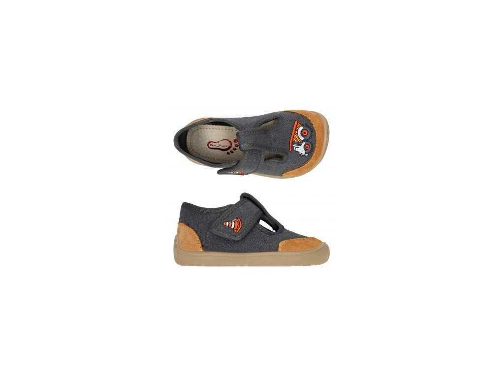 Dětské BAREFOOT papučky se zapínáním na suchý zip, který umožní pohodlné a rychlé obouvání doma i ve školce. Podrážka je vyrobena z termoplastického kaučuku o síle 3 mm, což zaručuje protiskluznost, ohebnost a velmi dobrou odolnost obuvi. Boty mají vyjímatelnou koženou stélku. Papučky krásně kopírují tvar nohy, díky výraznému prostoru v prstové části, čímž neomezují jejich pohyb při chůzi. Hezky sedí na nožce a mají lehce zpevněný opatek. Svrchní materiál je textil a vnitřní je také textil, jsou vyrobeny ze zdravotně nezávadných materiálů, podešev je protiskluzová.