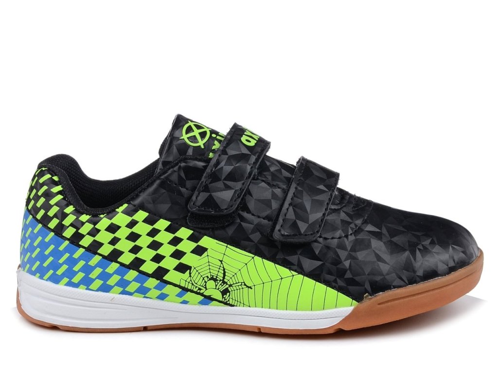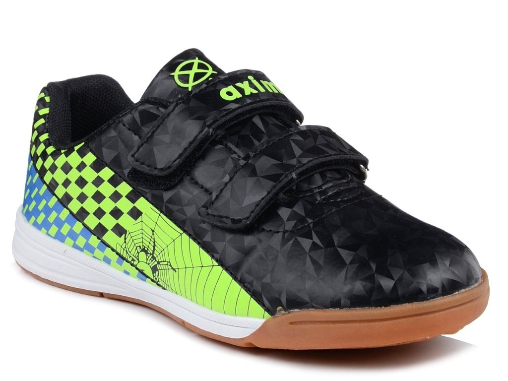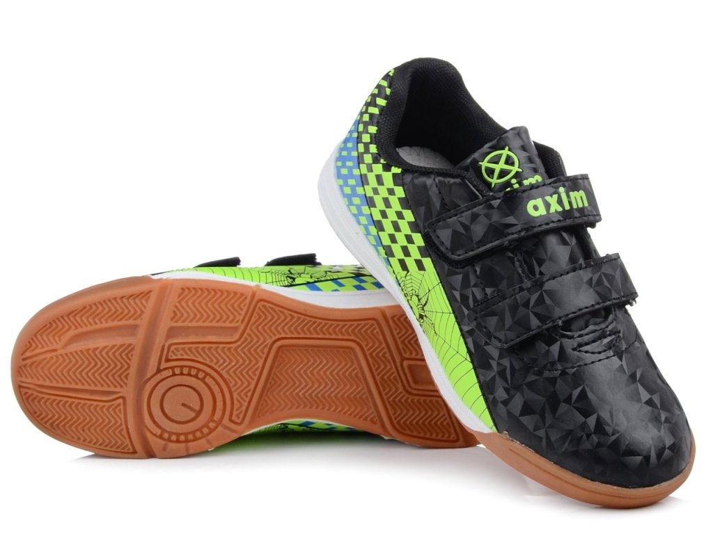 Dětské sportovní sálové tenisky Axim se zapínáním na dva suché zipy. Obuv je extrémně lehká a měkká. Je vyrobena ze syntetického materiálu, vnitřní část boty je textilní a stélka z přírodní kůže, která podporuje klenbu nohy. Transparentní podešev má velmi dobrou přilnavost, neklouže a nezanechává čáry. Váha jednoho páru je 340g. Obuv je vhodná na všechny druhy vnitřních sportů (do tělocvičny).