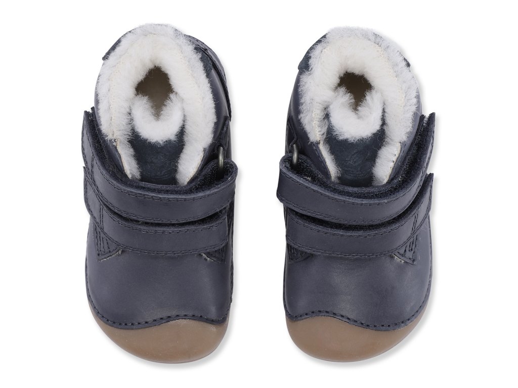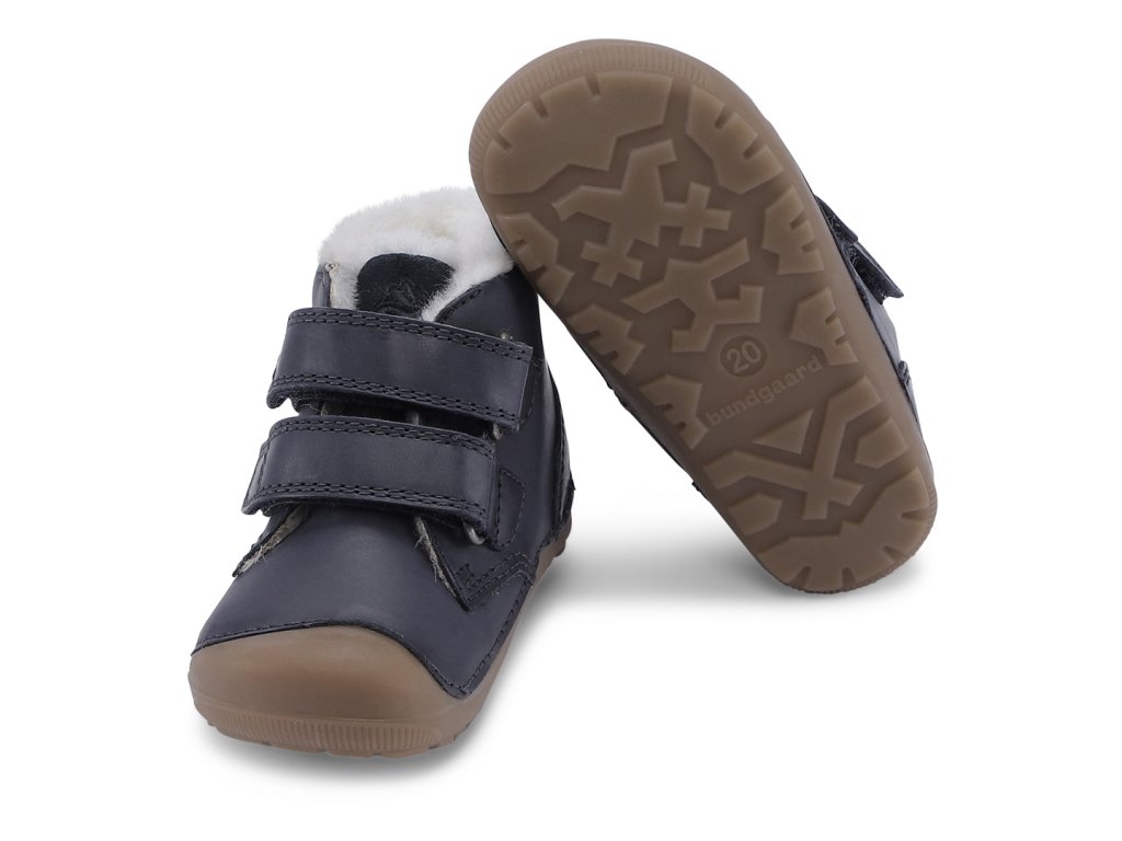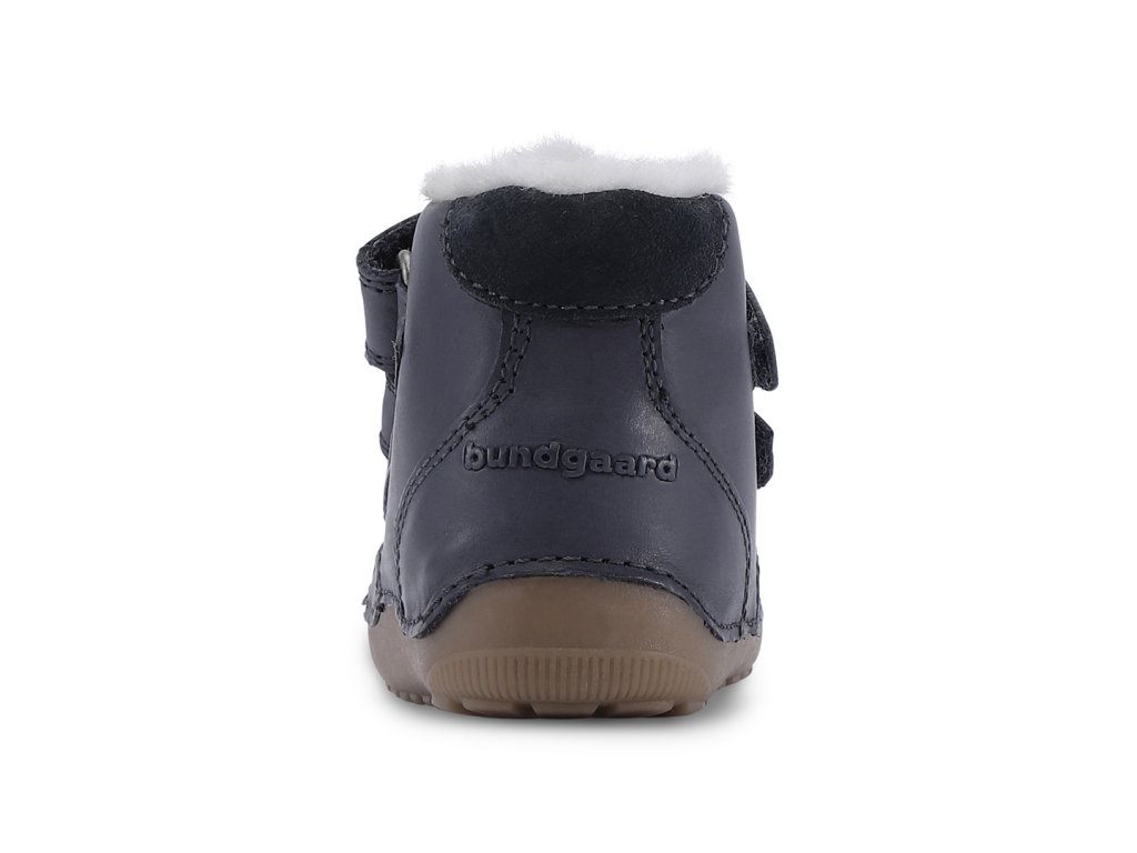 Barefoot zimní kožené boty značky Bundgaard jsou měkké, pohodlné boty s flexibilní gumovou podrážkou vhodné i pro ty nejmenší nožičky. Botičky mají velice ohebnou podrážku ve všech směrech, nulový drop. Podrážka je v přední části před prsty vyvýšená a chrání botičky před okopáním, stejně tak je mírně vyvýšená za patou, opatek je lehce zpevněný. Boty jsou zateplené ovčí vlnou, jsou nižší pro přirozený volný pohyb v kotníku a jsou vhodné i pro začínající chodce. Zapínání je na dva suché zipy, které umožňují dostatečnou regulaci na nízký nárt, ale je možnost povolit i pro nárt vyšší. Botičky sedí na normální až užší nožky, na úzké kotníky a jsou vhodné i pro dominantní palec. Dobrá voděodolnost, po naimpregnování snesou kratší chození v trávě i po dešti.