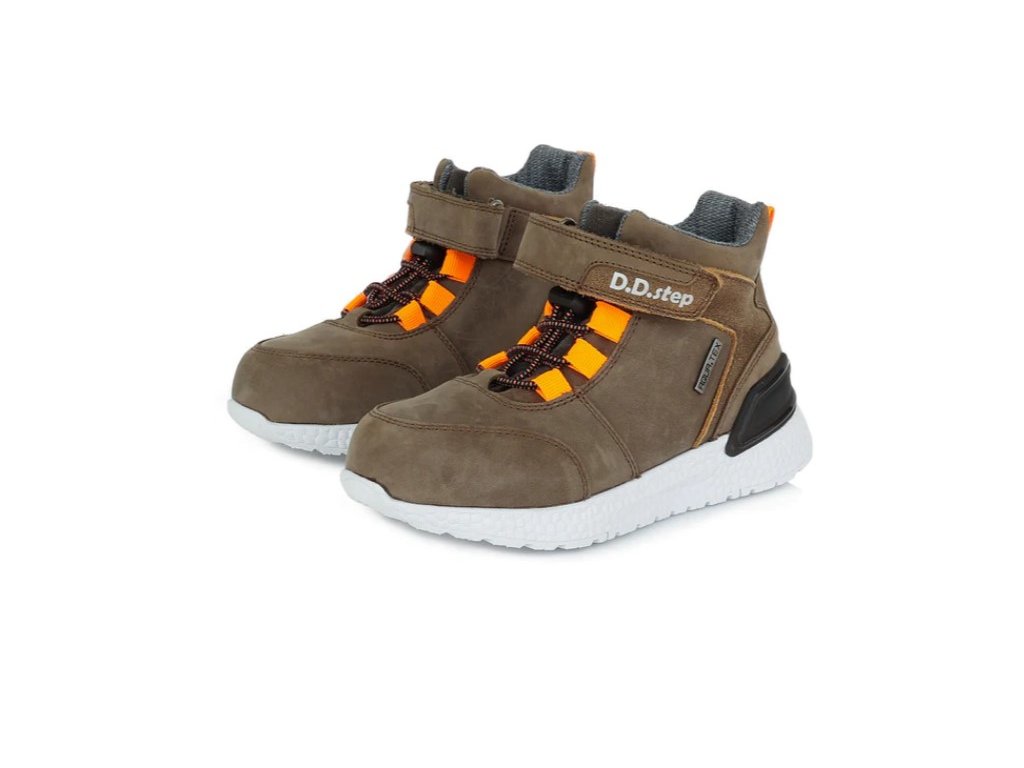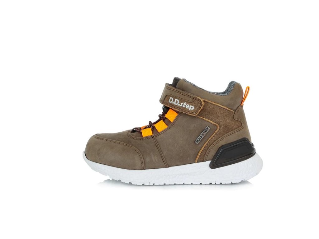 Celoroční botičky značky D.D.Step s voděodolnou membránou AQUA-TEX. Nepromokavá obuv je vybavena speciálním membránovým materiálem, který absorbuje a odvádí pot, ale zároveň zabraňuje pronikání vody a vlhkosti dovnitř boty. Zapínání je na stahovací gumičku v oblasti nártu a zapínáním na suchý zip v kotníku. Velice moderní design, jsou extrémně lehoučké a odolné proti vodě. Svršek je z přírodní kůže a textilu, uvnitř dobře odvětratelná textilní podšívka, špice je extra zpevněná pro lepší ochranu dětských prstíků. Boty mají měkké neklouzavé podešve s nízkou hmotností a vyjímatelnou koženou stélku s mírnou podporou klenby. Pevný opatek zajistí výbornou stabilitu. Botičky jsou vhodné na normální až úzké nožky, vyšší nárt a užší v patě.