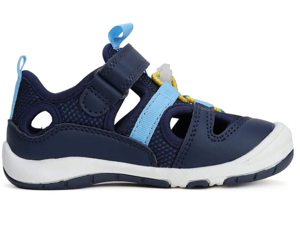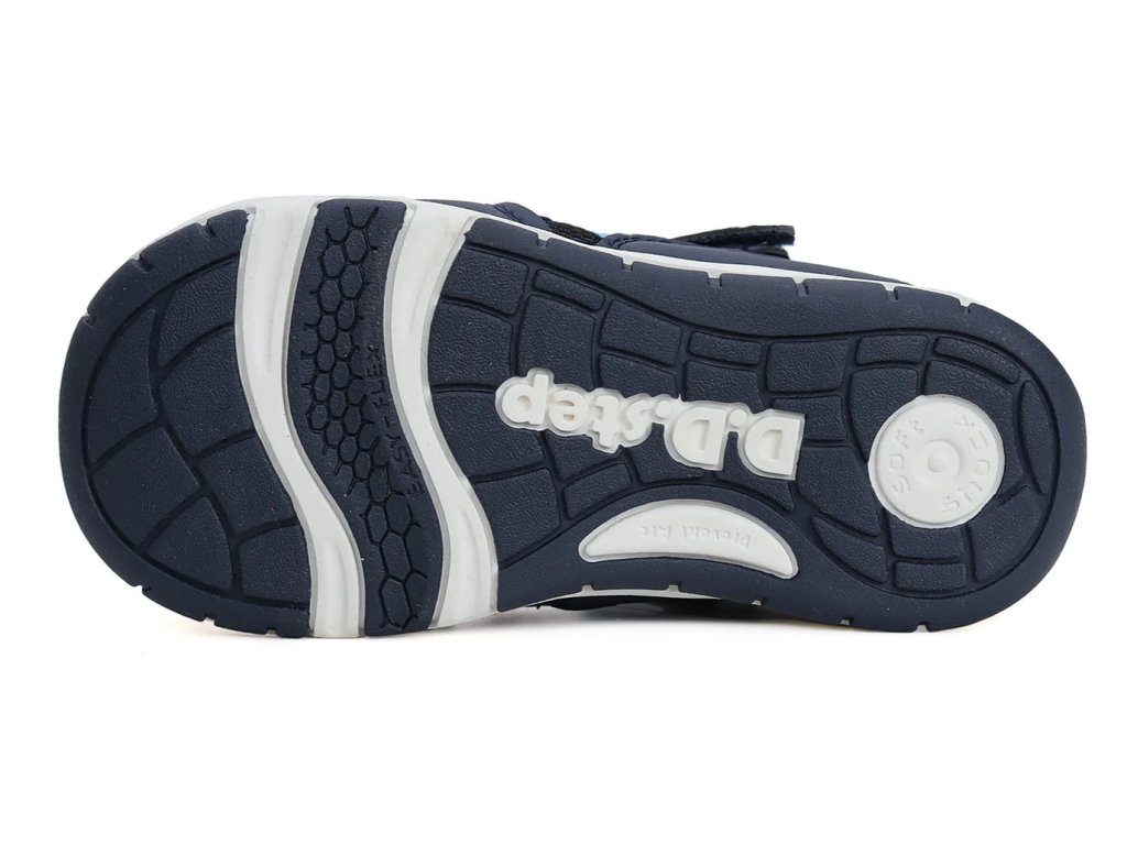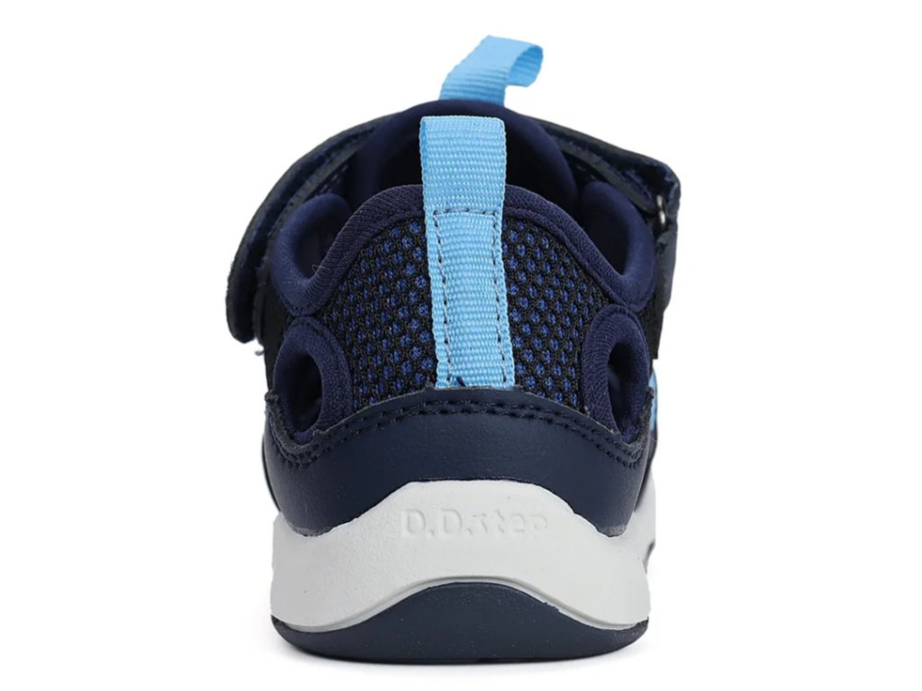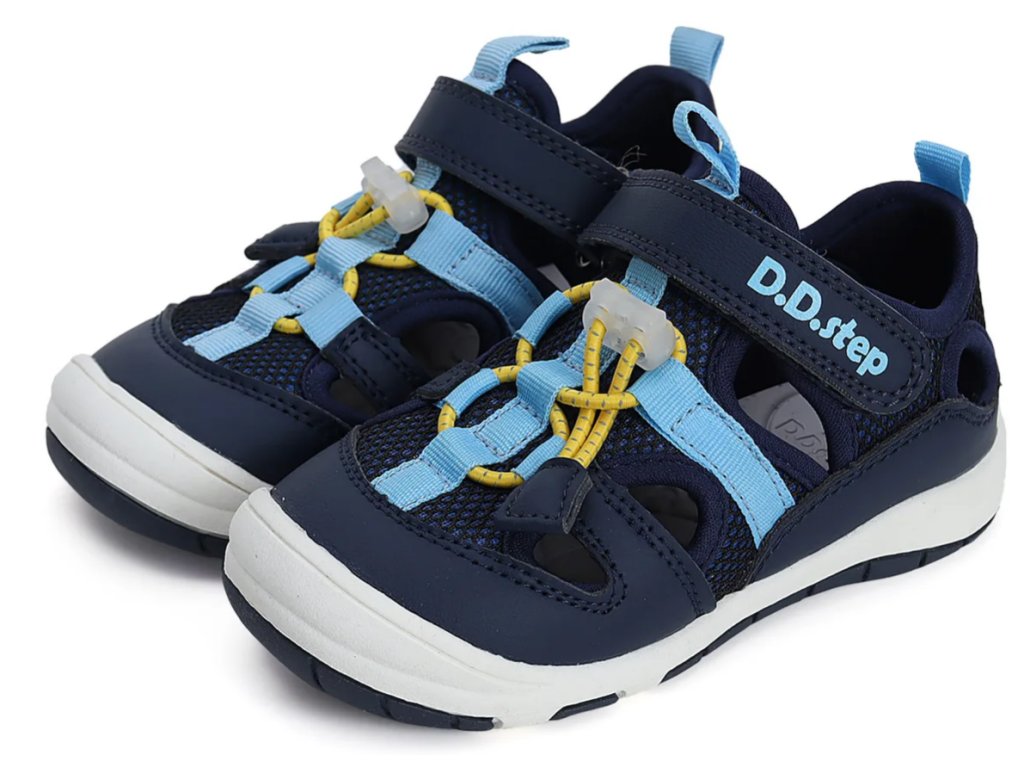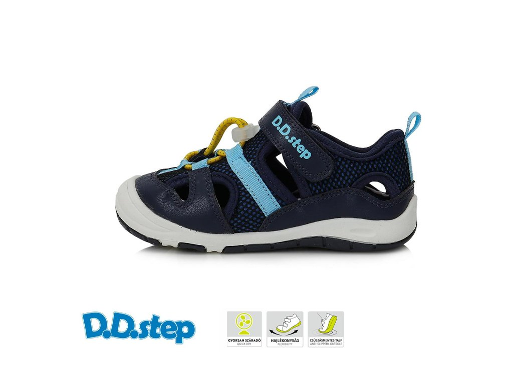 Dětské sportovní sandálky značky D.D.step jsou extrémně lehké a ohebné. Sandálky jsou vyrobeny z rychleschnoucího materiálu, svršek je kombinace prodyšné síťoviny a syntetiky, vnitřní část je ze syntetiky. Vyznačují se vysokým pohodlím a komfortem. Botičky mají prostornou kulatou špičku, která poskytuje dostatečný prostor pro prsty, vlepenou měkkou stélku (antibakteriální, pěnová) a lehce zpevněný opatek. Podešev je protiskluzová, lehká a ohebná, špička je pogumovaná. Zapínání je na jeden suchý zip a v nártu je stahování na gumičku.