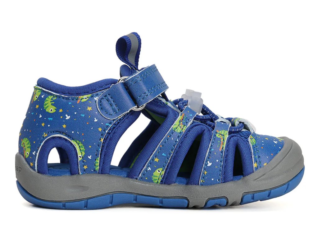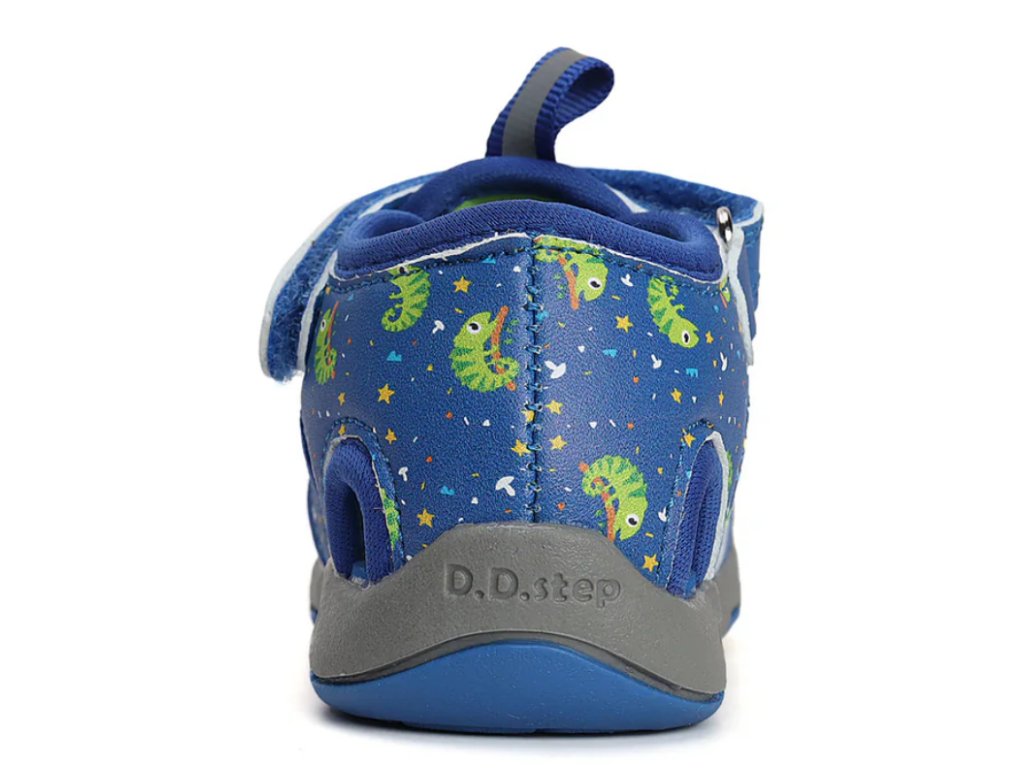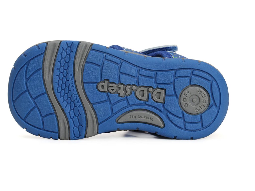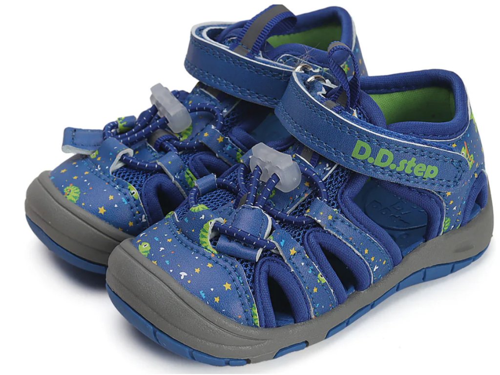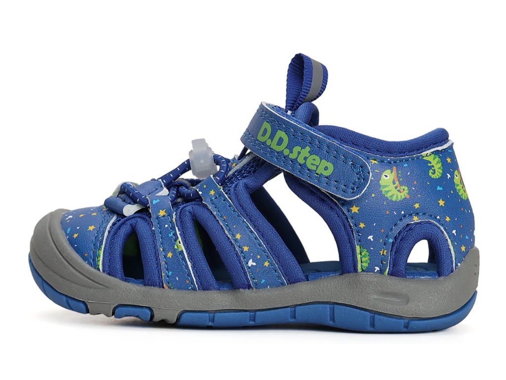 Dětské sportovní sandálky značky D.D.step jsou extrémně lehké a ohebné. Sandálky jsou vyrobeny z rychleschnoucího materiálu, svršek je kombinace prodyšné síťoviny a syntetiky, vnitřní část je ze syntetiky. Vyznačují se vysokým pohodlím a komfortem. Botičky mají prostornou kulatou špičku, která poskytuje dostatečný prostor pro prsty, vlepenou měkkou stélku (antibakteriální, pěnová) a lehce zpevněný opatek. Podešev je protiskluzová, lehká a ohebná, špička je pogumovaná. Zapínání je na jeden suchý zip a v nártu je stahování na gumičku.
