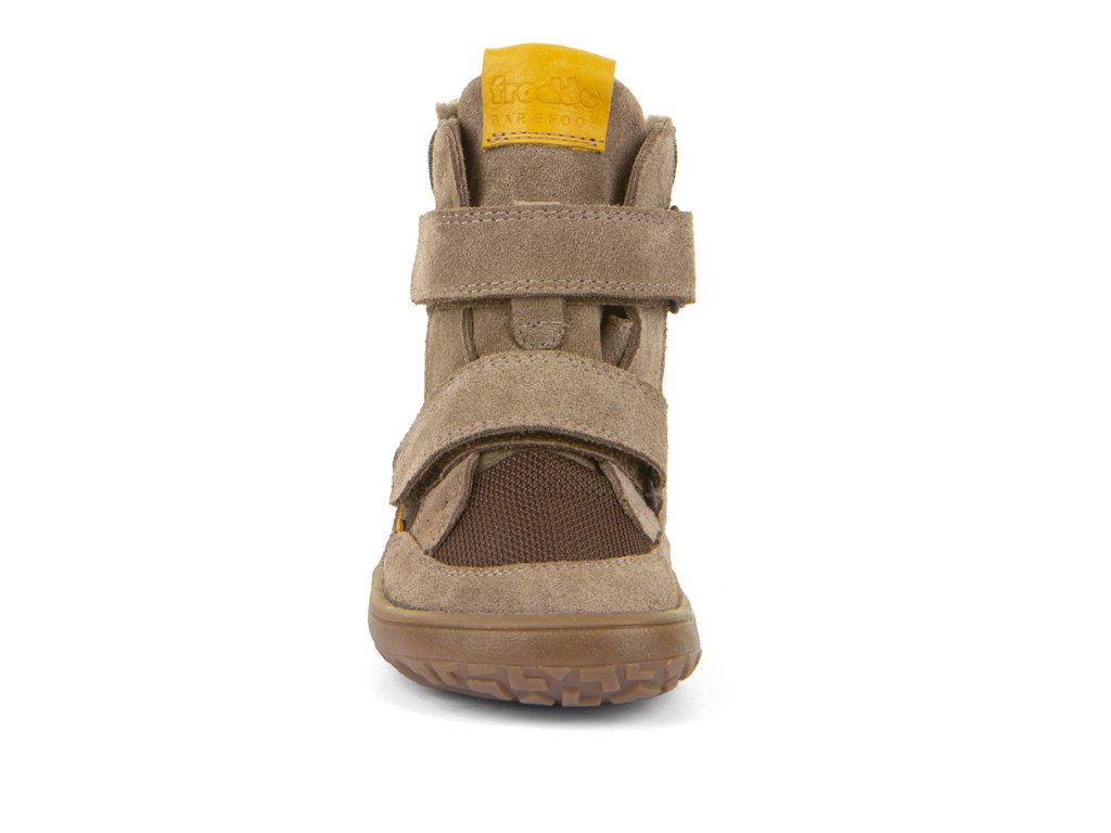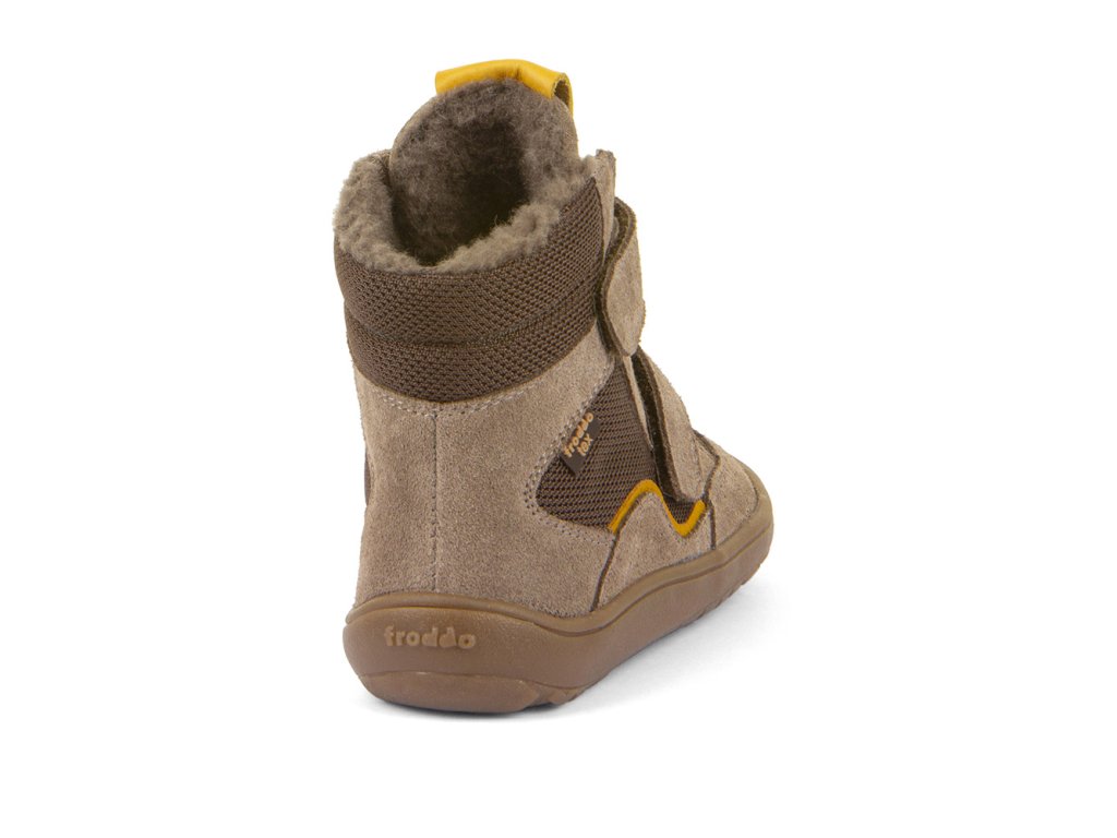 Barefoot zimní vyšší (nad kotník) boty od chorvatské značky Froddo s dostatečnou tepelnou izolací a voděodolnou membránou. Botičky jsou extrémně měkké, lehké a ohebné všemi směry, i když se zpočátku zdá podrážka tužší, nošením velmi rychle změkne. Sedí na normální až mírně širší nohu, ale lze je velmi dobře utáhnout okolo kotníku a díky zapínání na dva suché zipy je lze dobře regulovat na nárt. Boty jsou vyrobeny z vysoce kvalitní přírodní kůže a textilie s membránou Froddo-Tex, která odpuzuje vodu a neobsahuje nebezpečné látky a sloučeniny, kůže je velmi příjemná a odolná, podšívka je z ovčí vlny. Širší tvar špičky poskytne dostatek prostoru dětským prstíkům, praktické přetažení gumy přes špičku (ochrana před promáčením a odíráním). Nohy mohou vnímat povrch po kterém chodí díky rovné a tenké podrážce. Boty mají nulový drop, nová extra přilnavá podrážka, která neklouže. Stélka je plochá vyjímatelná z ovčí kožešiny.