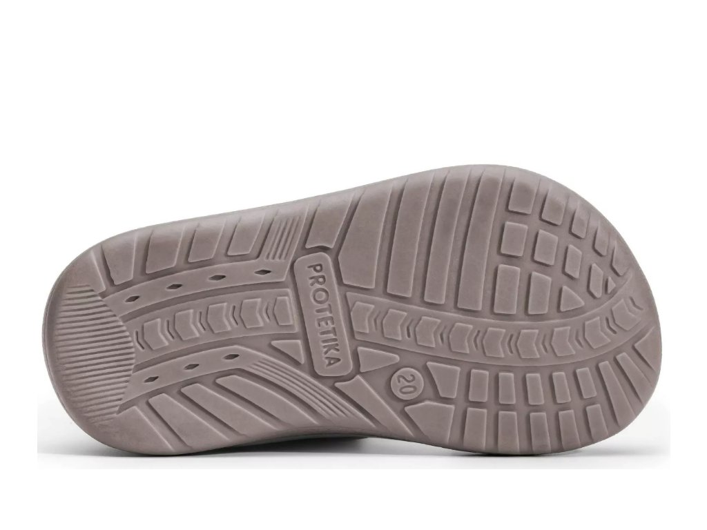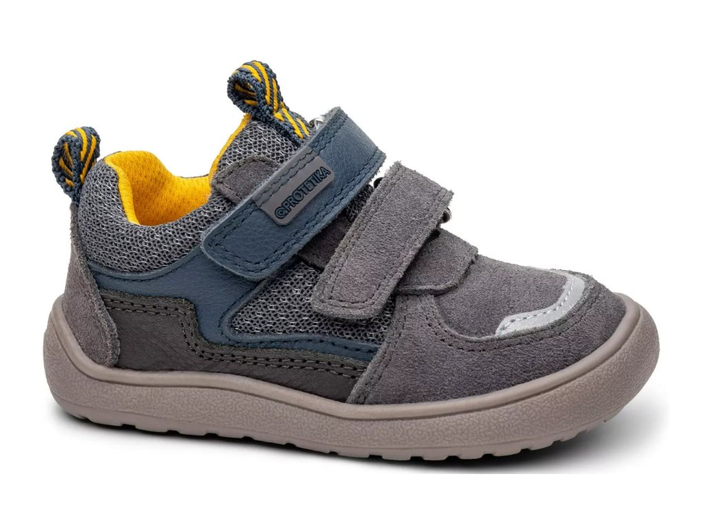 BAREFOOT boty/tenisky značky PROTETIKA jsou nízké celoroční boty. Jde o zcela nový model, který má úplně novou podrážku a lepší tvar oproti starším modelům. Obuv má flexibilní podešev ve směru chůze i příčně a lehce zpevněnou patu, špička je anatomicky tvarovaná a zaručuje dostatek místa pro prsty, vhodná i pro dominantní palec. Oproti starším modelům jsou více flexibilnější, mírně širší v přední části a užší v patě. Zapínání na dva suché zipy, které zaručují dobrou regulaci výšky nártu a samozřejmostí je zvýšená okopová špička i vyvýšení v patě. Svršek je vyrobený z kombinace přírodní kůže a textilu, vnitřní část je textilní s vyjímatelnou koženou stélkou (netvarovaná). Podrážka je gumová s jemným vzorkem.