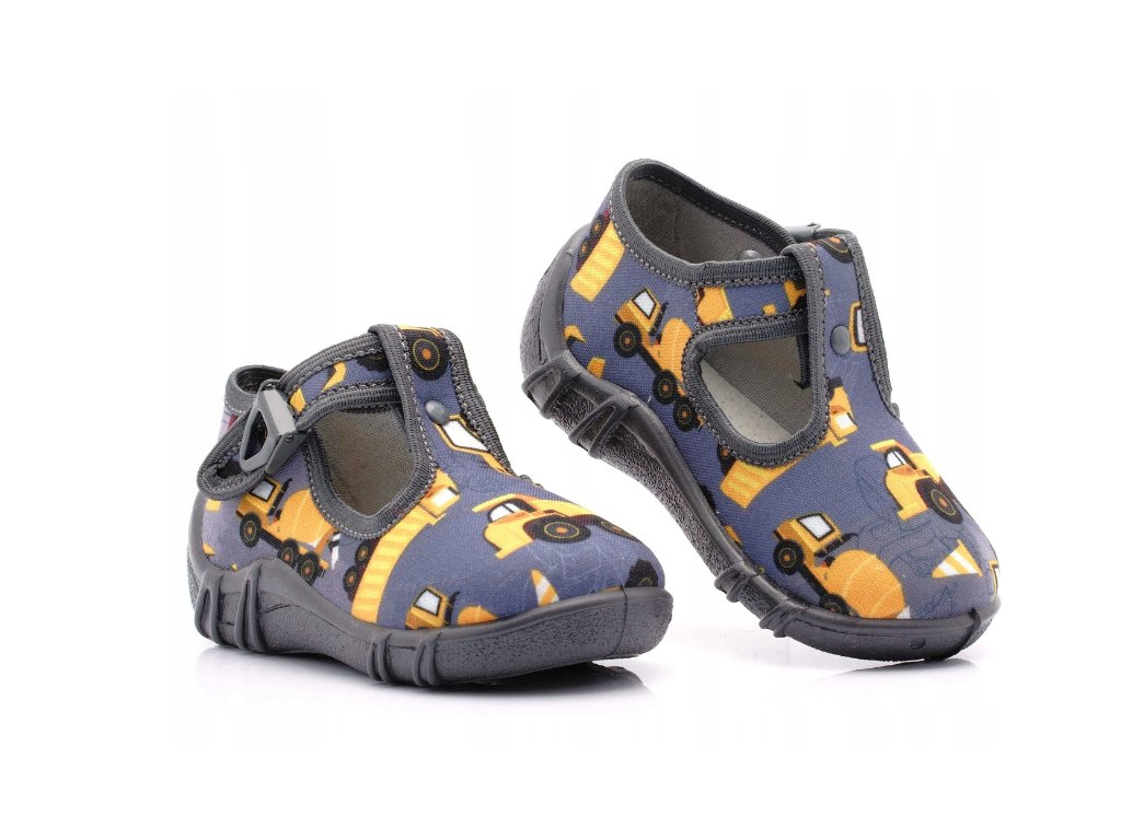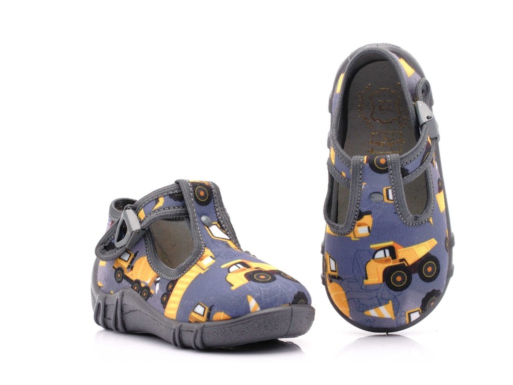 Chlapecké papučky značky RAWEKS s anatomicky tvarovanou koženou stélkou - šedé s bagry.