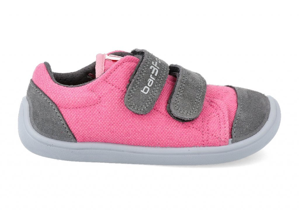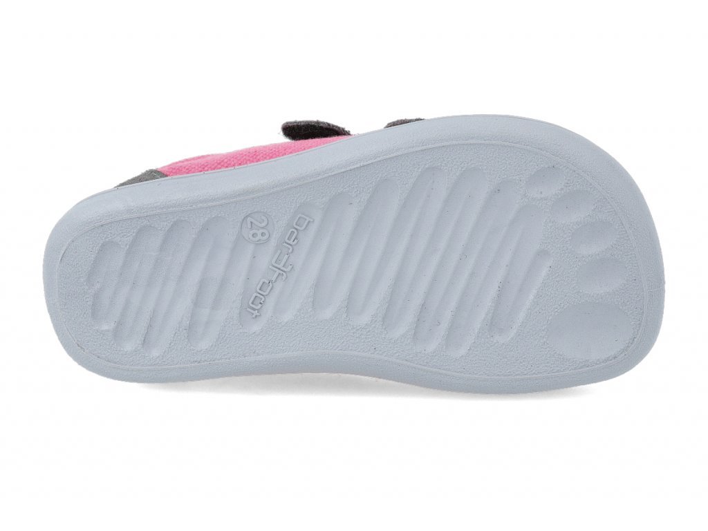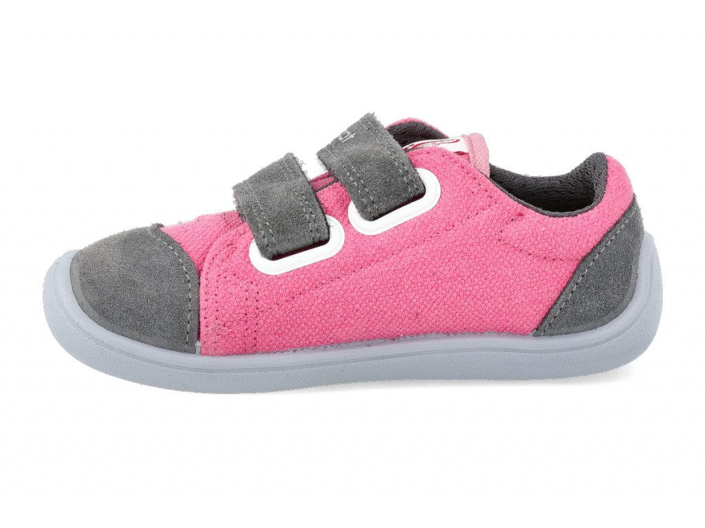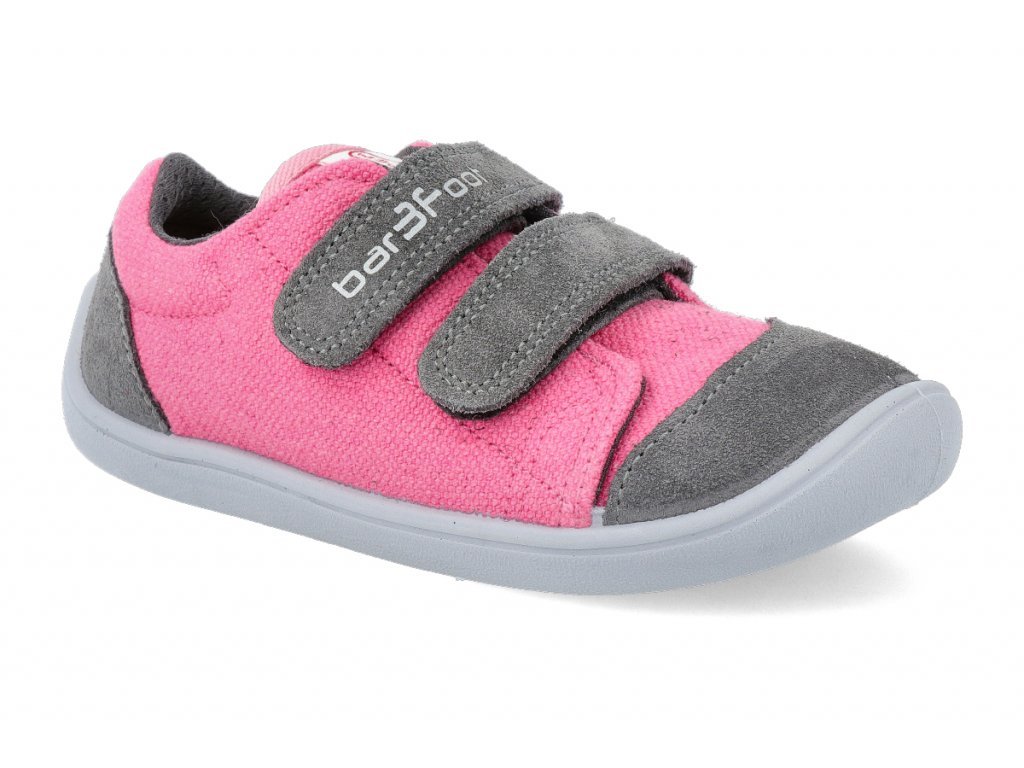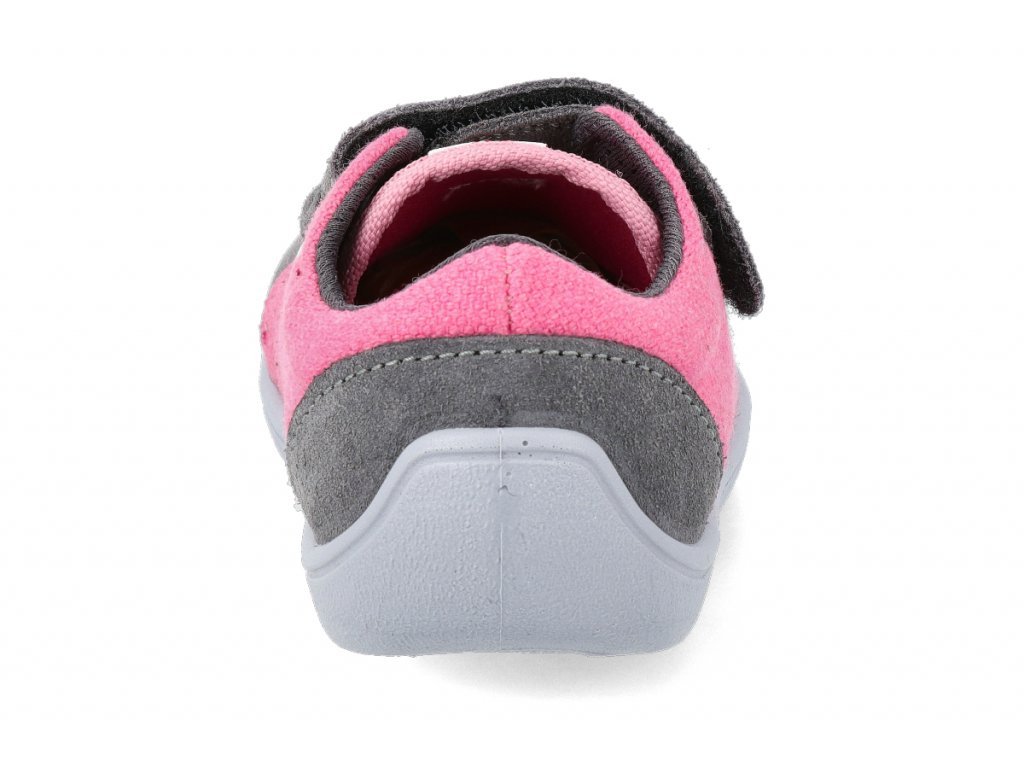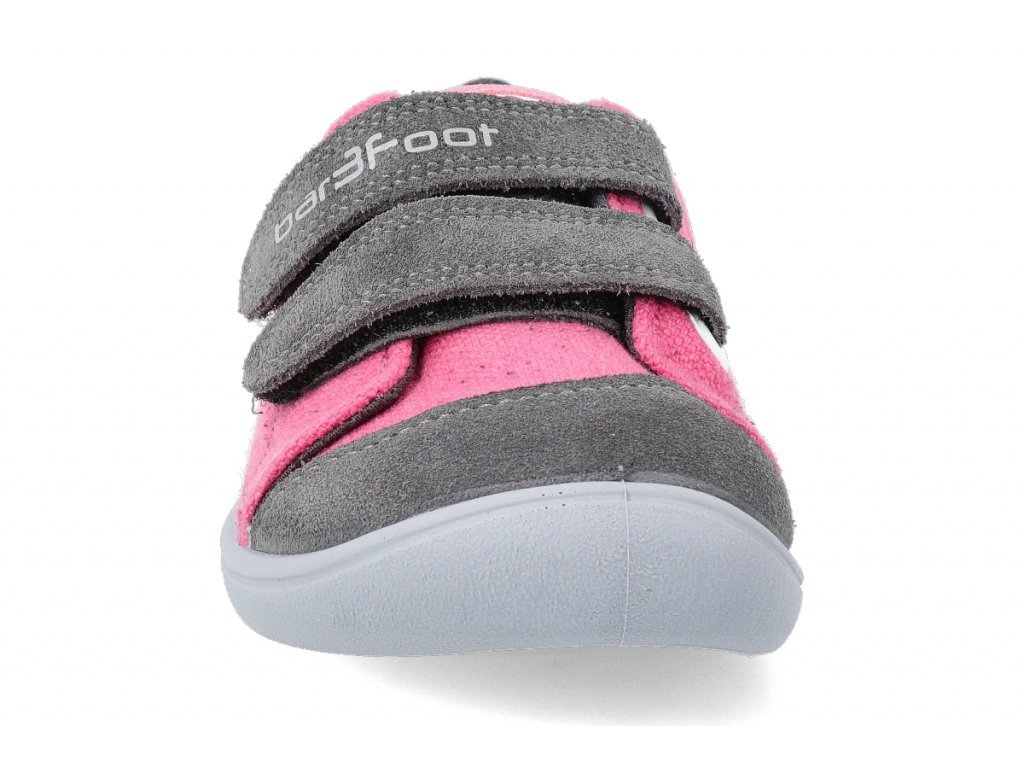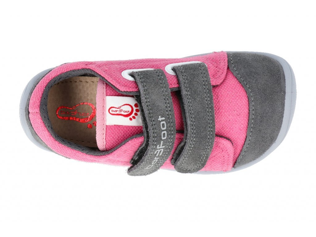 Dětské BAREFOOT tenisky 3F se zapínáním na dva suché zipy, který umožní pohodlné a rychlé obouvání, zároveň jdou velmi dobře přizpůsobit nártu. Svrchní materiál je v kombinaci bavlněné tkaniny a imitace semiše a příjemná vnitřní podšívka je také textilní, jsou vyrobeny ze zdravotně nezávadných materiálů, podešev je protiskluzová. Podrážka je vyrobena z termoplastického kaučuku o síle 3 mm, což zaručuje protiskluznost, ohebnost a velmi dobrou odolnost obuvi, tenisky mají nulový drop. Opatek je mírně zpevnění, jeho funkci částečně nahrazuje zvýšená podrážka za patou. Boty mají vyjímatelnou koženou stélku bez podpory klenby a bez tvarování, je ohebná, pěnová s koženým nášlapem, kožená vložka obsahuje prvky aktivního uhlí, které pohlcují zápach a je antibakteriální. Tenisky krásně kopírují tvar nohy, díky výraznému prostoru v prstové části, čímž neomezují jejich pohyb při chůzi. Hezky sedí na nožce a mají lehce zpevněný opatek.