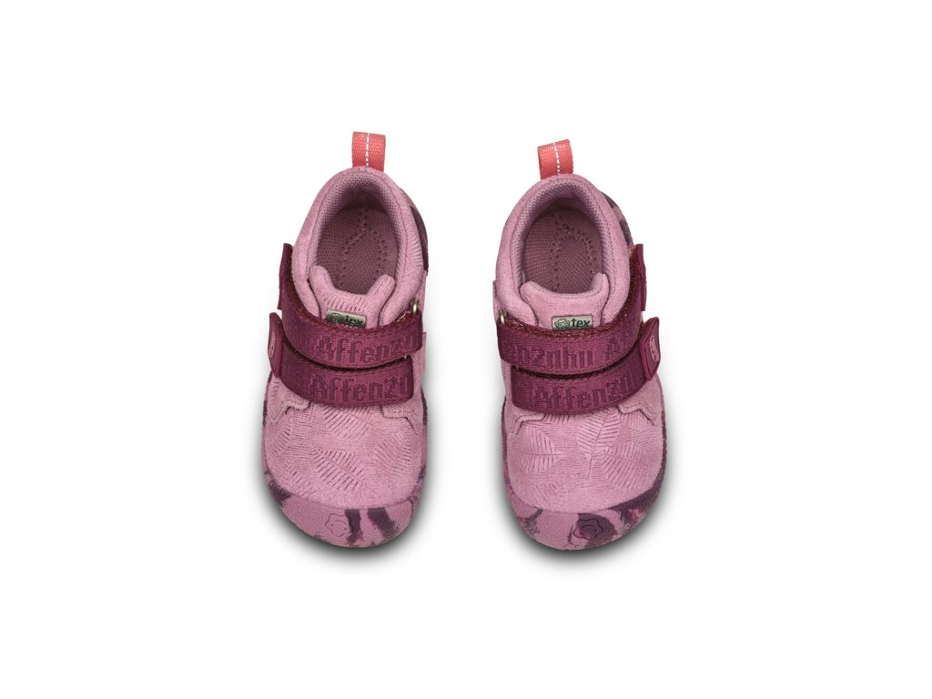 Dětské barefoot boty německé značky Affenzahn jsou měkké a lehké kožené botičky vhodné pro první krůčky ale i pro pokročilé chodce. Díky tenké, ohebné a neklouzavé podrážce umožňují přirozenou dynamiku chůze a postupné odvalování chodidla. To spolu s dostatečnou šířkou a místem pro prsty umožňuje přirozený a zdravý vývoj dětských nohou. Nově vyvinutá podrážka poskytuje přilnavost a stylový design skvěle vypadá. Jsou voděodolné, reflexní a protiskluzové. Svrchní materiál je ze semišové kůže s reliéfním povrchem, podšívka je odolná proti chladu, podešev je protiskluzová a tvoří ji 30% přírodní pryž a 70% syntetická pryž, stélku mají z rostlinného materiálu (pěna BLOOM) a syntetické pěny. Boty se zapínají na dva suché zipy, takže děti nebudou mít s obouvání žádný problém, boty mají gumový okop. Na zadní straně se nachází puzzle obrázek, pro rozlišení pravé a levé boty a jsou vybaveny reflexními prvky.