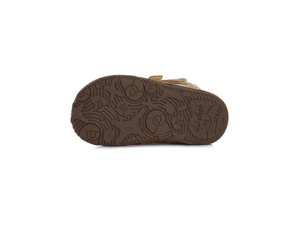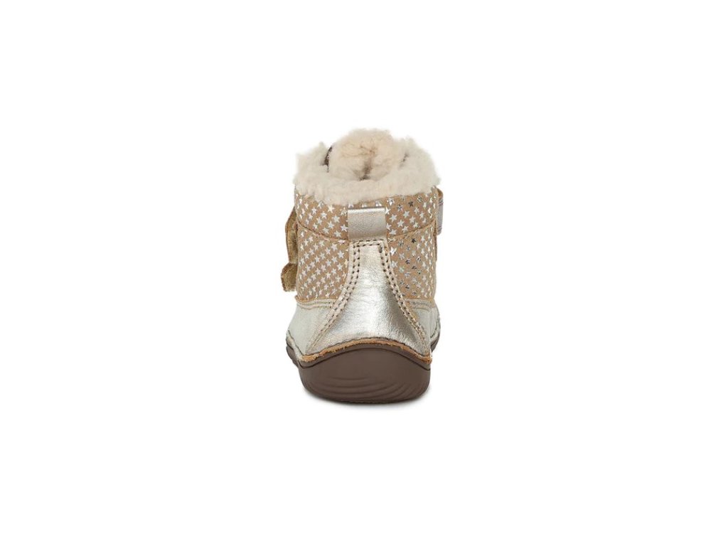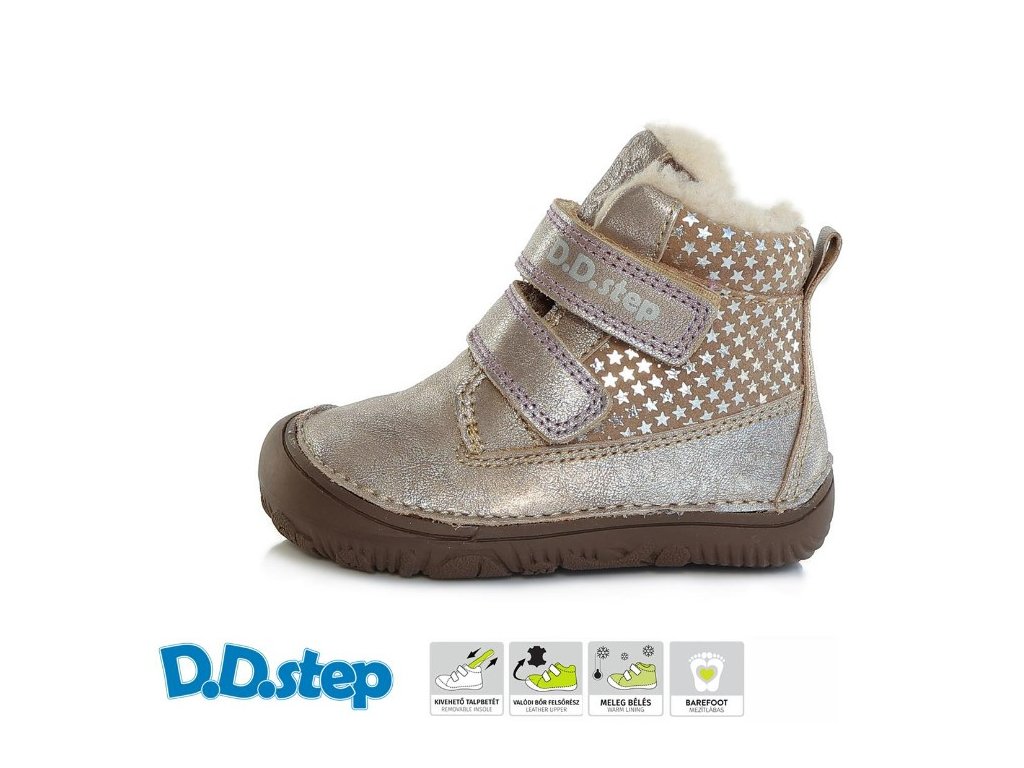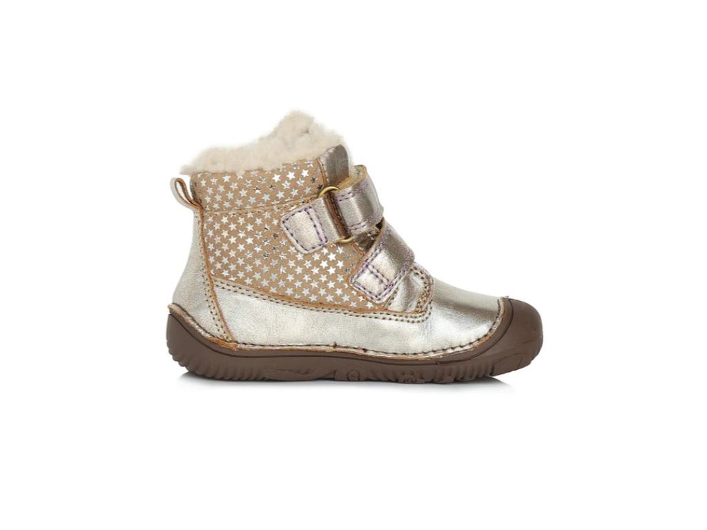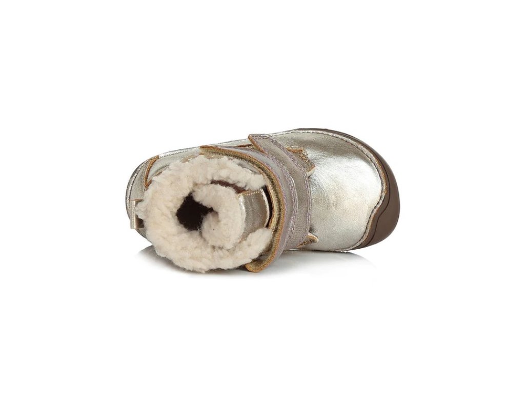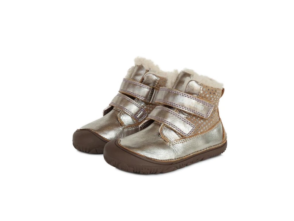 Zimní barefoot kožené botičky značky D.D.Step jsou vyráběny z měkkých kůží, vyznačují se vysokým pohodlím, komfortem a atraktivním vzhledem. Použité přírodní materiály, testované v české laboratoři. Nová speciální technologie šití zaručující flexibilitu, komfort a dlouhou životnost. Prostorná barefoot špička poskytující dostatečný prostor pro prsty. Svršek boty je z přírodní kůže, mají nezpevněný opatek a vnitřní část je zateplená kožíškem včetně vyjímatelné stélky. Svršek je z textilu, ohebné podešve jsou z 100% přírodní pryže, které jsou flexibilní, neklouzavé s nízkou hmotností. Vpředu mírný okop chránící špičku a zapínání na dva suché zipy. Botička s nulovým dropem - poklesem = žádný rozdíl mezi špičkou a patou. Konstrukce obuvi je navržena tak, aby co nejméně bránila zdravému vývoji dětské nohy. Nástřik chránící botu proti vlhku. Vhodná i pro začínající chodce.
