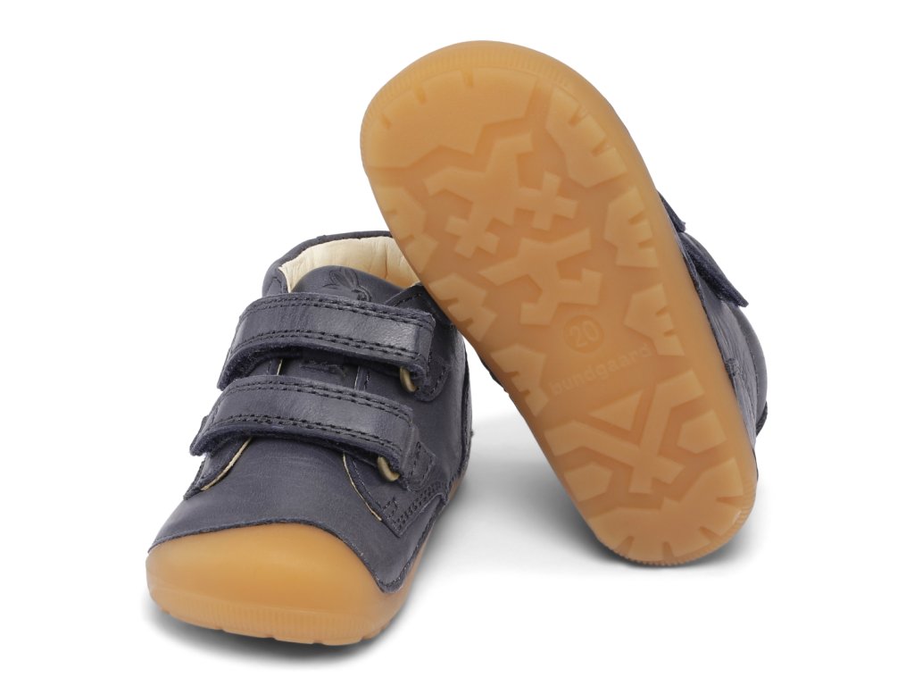 Barefoot celoroční kožené boty značky Bundgaard jsou měkké, pohodlné boty s flexibilní gumovou podrážkou vhodné i pro ty nejmenší nožičky. Botičky mají velice ohebnou podrážku ve všech směrech, nulový drop. Podrážka je v přední části před prsty vyvýšená a chrání botičky před okopáním, stejně tak je mírně vyvýšená za patou, opatek je lehce zpevněný. Boty mají vyjímatelnou stélku, která je z vrchní strany kožená a ze spodní strany je 1 mm pěny, je bez tvarování a ohebná. Pod touto stélkou je ještě textilní tenká vrstva pro měkčí došlap, je tedy možné chodit i bez kožené stélky. Zapínání je na dva suché zipy, které umožňují dostatečnou regulaci na nízký nárt, ale je možnost povolit i pro nárt vyšší. Botičky sedí na normální až užší nožky, na úzké kotníky a jsou vhodné i pro dominantní palec.