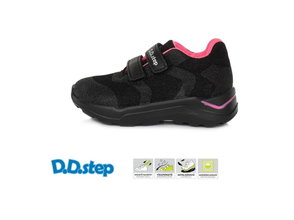 Celoroční sportovní boty/tenisky maďarské značky D.D.Step mají velice moderní design, jsou lehoučké a prodyšné. Svršek je textilní, zapínací pásky jsou kožené, vnitřní podšívka je textilní. Boty mají měkké neklouzavé podešve s nízkou hmotností a vyjímatelnou koženou stélku s mírnou podporou klenby. Stélka má speciální tvar pro maximální možnou stabilitu, ortopedická klenba podporuje zdravý vývoj dětské nožky a speciální materiál tlumí nárazy při běhu i chůzi. Pevný opatek zajistí výbornou stabilitu. Prostorná kulatá špička poskytuje dostatečný prostor pro prsty, vepředu je mírný okop chránící špičku.
