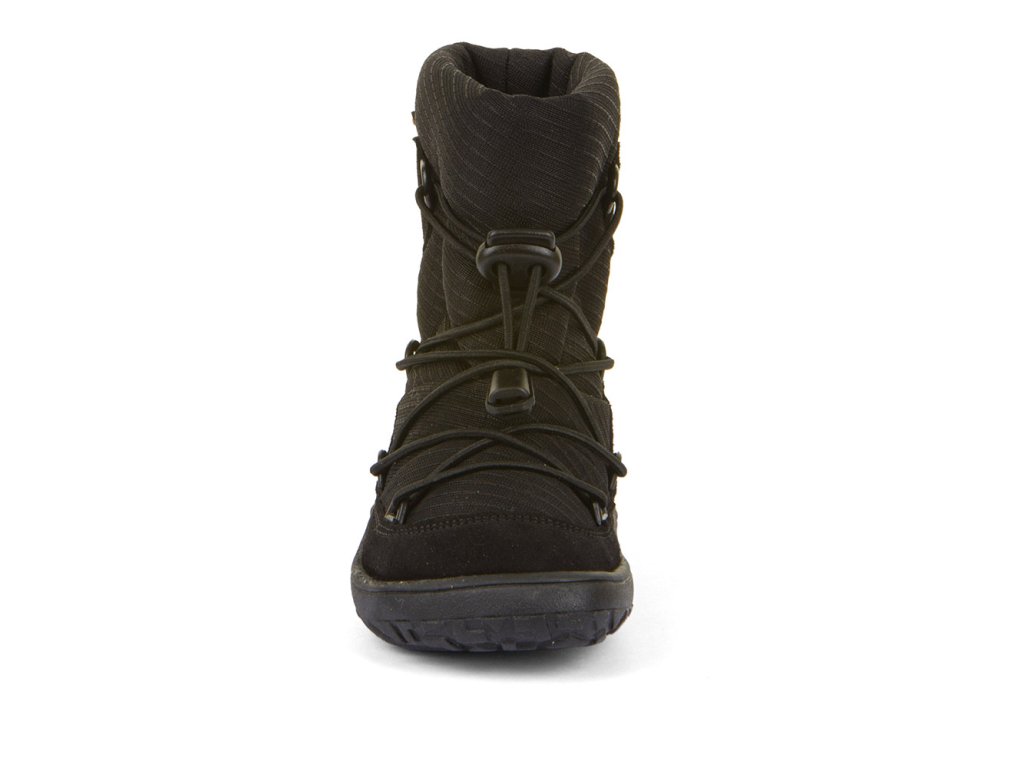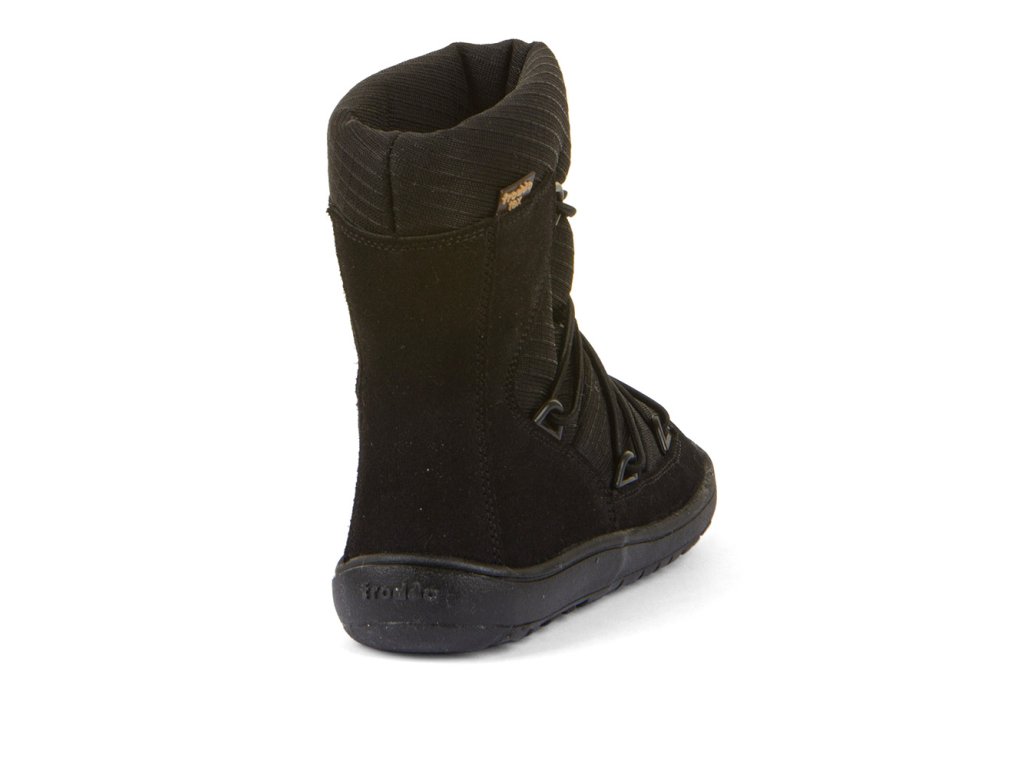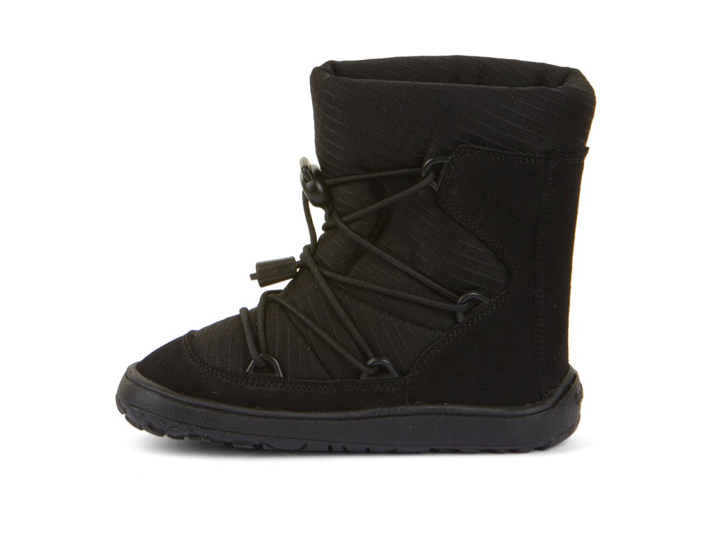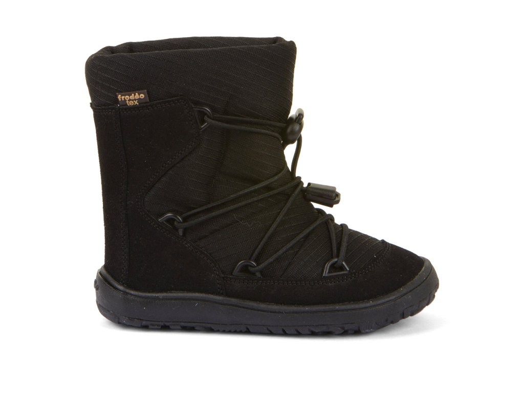 Barefoot zimní vyšší (nad kotník) boty od chorvatské značky Froddo s dostatečnou tepelnou izolací a voděodolnou membránou. Botičky jsou extrémně měkké, lehké a ohebné všemi směry, i když se zpočátku zdá podrážka tužší, nošením velmi rychle změkne. Sedí na normální až mírně širší nohu, ale lze je velmi dobře utáhnout okolo kotníku a díky novému stahovacímu zapínání je lze dobře regulovat jak na nárt, okolo kotníku i okolo lýtka. Boty jsou vyrobeny z vysoce kvalitní přírodní kůže a textilie s membránou Froddo-Tex, která odpuzuje vodu a neobsahuje nebezpečné látky a sloučeniny, kůže je velmi příjemná a odolná, podšívka je z ovčí vlny. Širší tvar špičky poskytne dostatek prostoru dětským prstíkům, praktické přetažení gumy přes špičku (ochrana před promáčením a odíráním). Nohy mohou vnímat povrch po kterém chodí díky rovné a tenké podrážce. Boty mají nulový drop, nová extra přilnavá podrážka, která neklouže. Stélka je plochá vyjímatelná z ovčí kožešiny.
