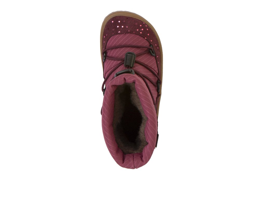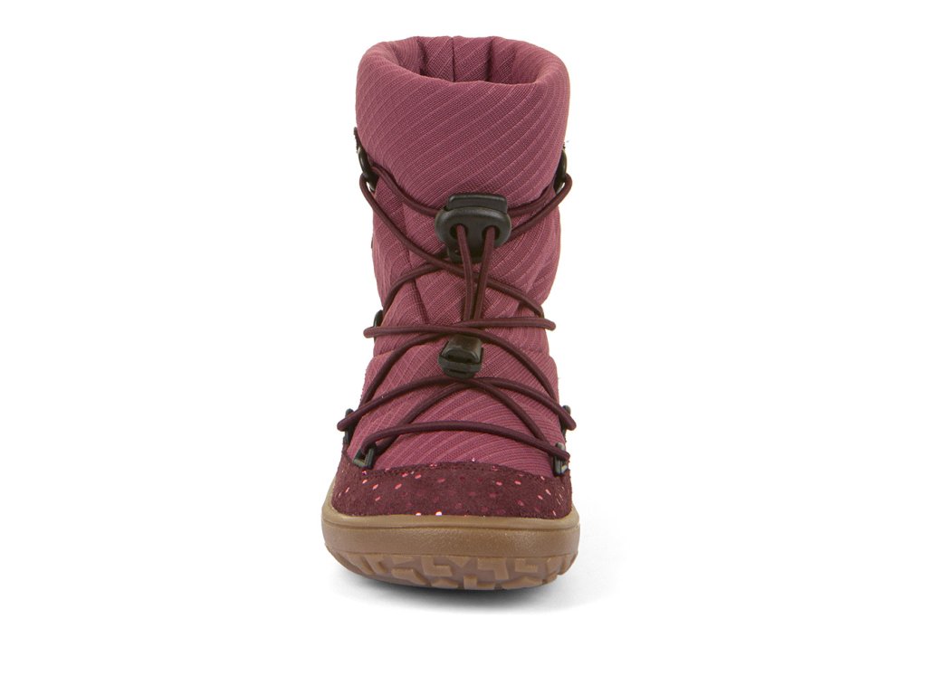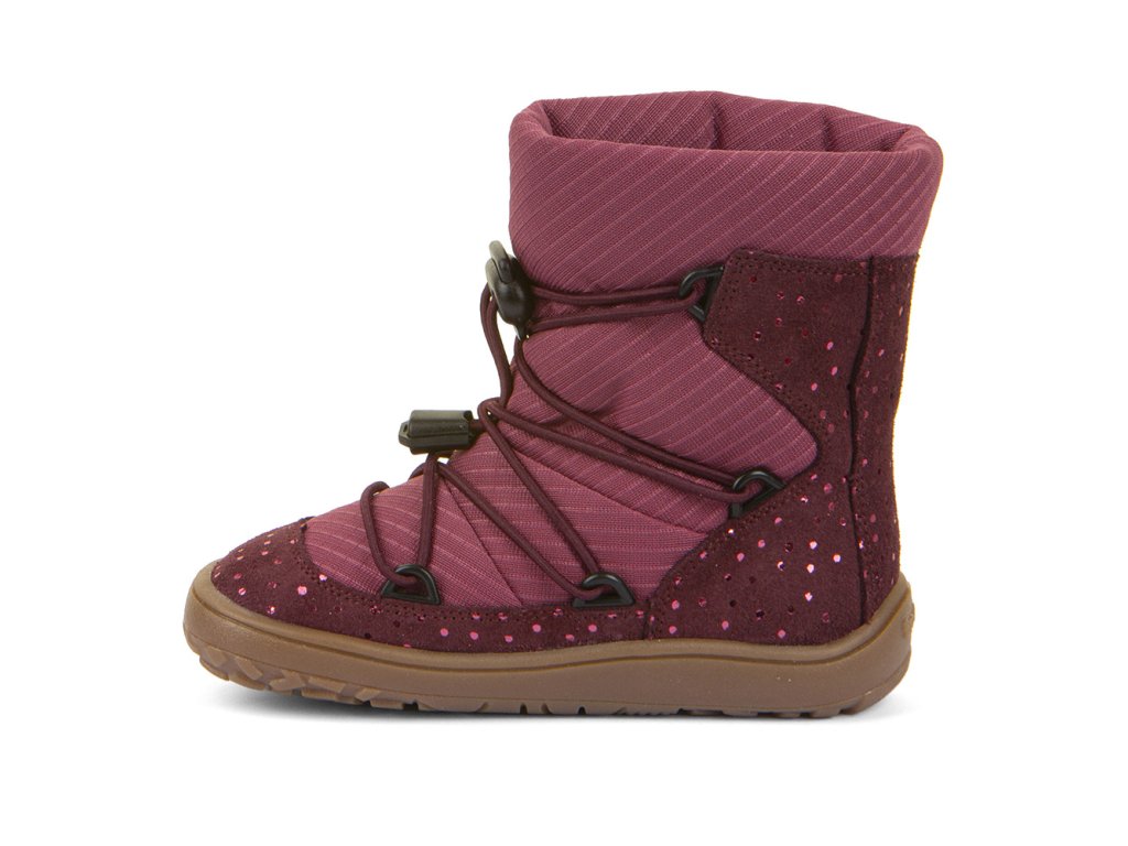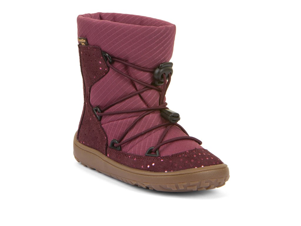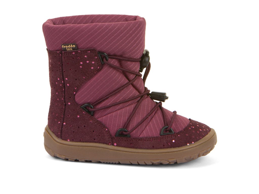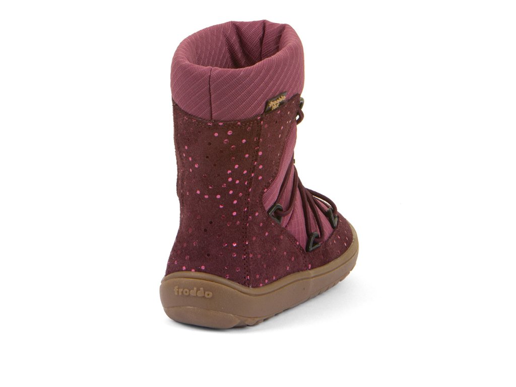Barefoot zimní vyšší (nad kotník) boty od chorvatské značky Froddo s dostatečnou tepelnou izolací a voděodolnou membránou. Botičky jsou extrémně měkké, lehké a ohebné všemi směry, i když se zpočátku zdá podrážka tužší, nošením velmi rychle změkne. Sedí na normální až mírně širší nohu, ale lze je velmi dobře utáhnout okolo kotníku a díky novému stahovacímu zapínání je lze dobře regulovat jak na nárt, okolo kotníku i okolo lýtka. Boty jsou vyrobeny z vysoce kvalitní přírodní kůže a textilie s membránou Froddo-Tex, která odpuzuje vodu a neobsahuje nebezpečné látky a sloučeniny, kůže je velmi příjemná a odolná, podšívka je z ovčí vlny. Širší tvar špičky poskytne dostatek prostoru dětským prstíkům, praktické přetažení gumy přes špičku (ochrana před promáčením a odíráním). Nohy mohou vnímat povrch po kterém chodí díky rovné a tenké podrážce. Boty mají nulový drop, nová extra přilnavá podrážka, která neklouže. Stélka je plochá vyjímatelná z ovčí kožešiny.