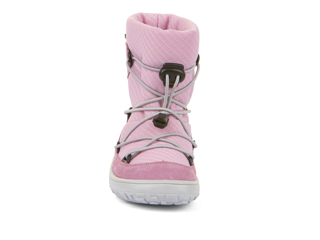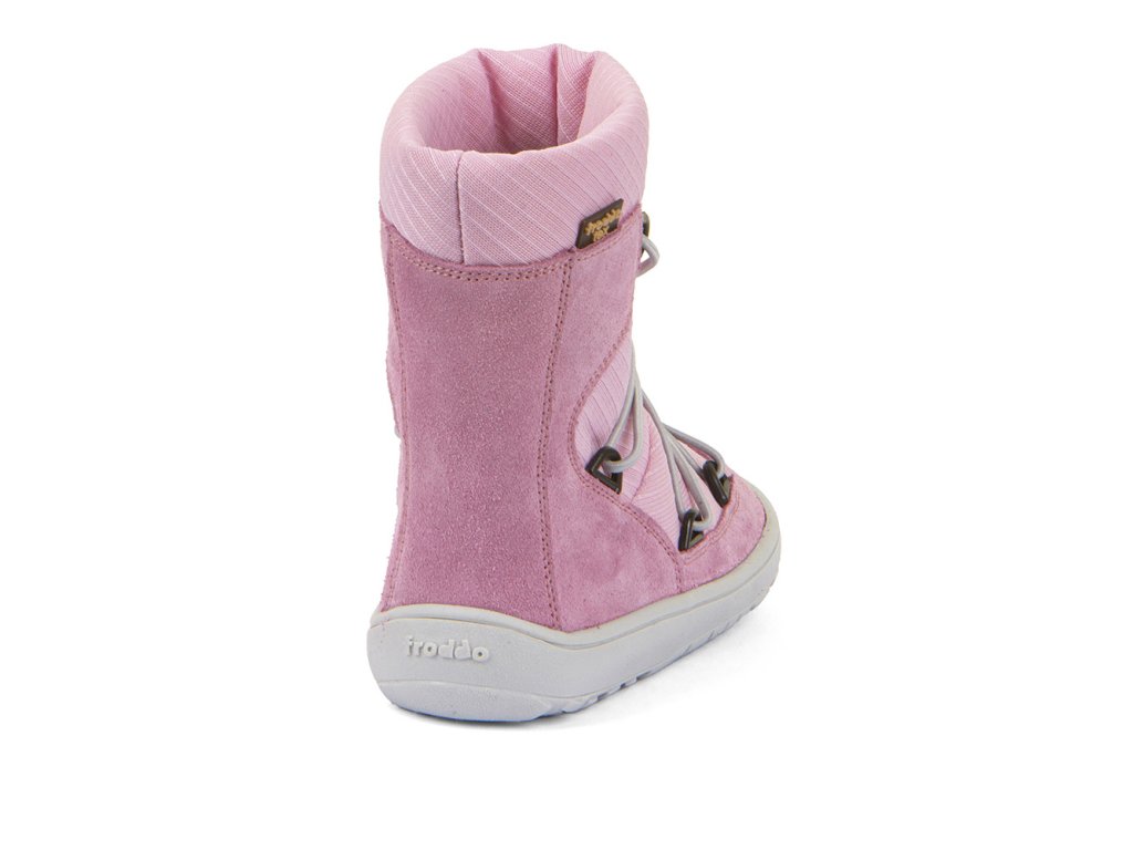 Dívčí zimní vyšší barefoot obuv s voděodolnou membránou FRODDO TRACK TEX WOOL v světle růžové barvě.