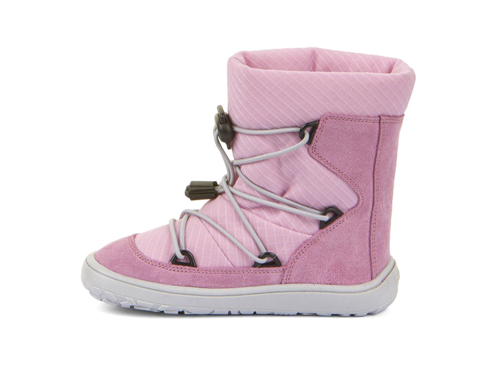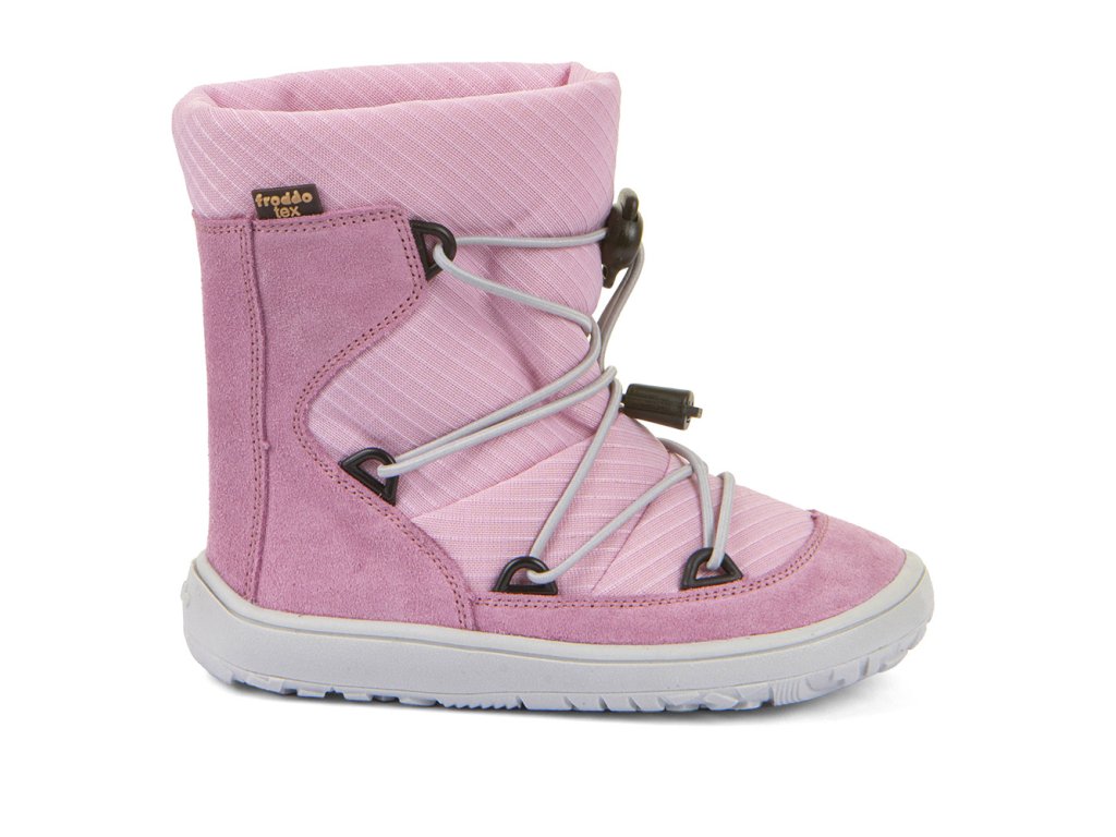 Barefoot zimní vyšší (nad kotník) boty od chorvatské značky Froddo s dostatečnou tepelnou izolací a voděodolnou membránou. Botičky jsou extrémně měkké, lehké a ohebné všemi směry, i když se zpočátku zdá podrážka tužší, nošením velmi rychle změkne. Sedí na normální až mírně širší nohu, ale lze je velmi dobře utáhnout okolo kotníku a díky novému stahovacímu zapínání je lze dobře regulovat jak na nárt, okolo kotníku i okolo lýtka. Boty jsou vyrobeny z vysoce kvalitní přírodní kůže a textilie s membránou Froddo-Tex, která odpuzuje vodu a neobsahuje nebezpečné látky a sloučeniny, kůže je velmi příjemná a odolná, podšívka je z ovčí vlny. Širší tvar špičky poskytne dostatek prostoru dětským prstíkům, praktické přetažení gumy přes špičku (ochrana před promáčením a odíráním). Nohy mohou vnímat povrch po kterém chodí díky rovné a tenké podrážce. Boty mají nulový drop, nová extra přilnavá podrážka, která neklouže. Stélka je plochá vyjímatelná z ovčí kožešiny.