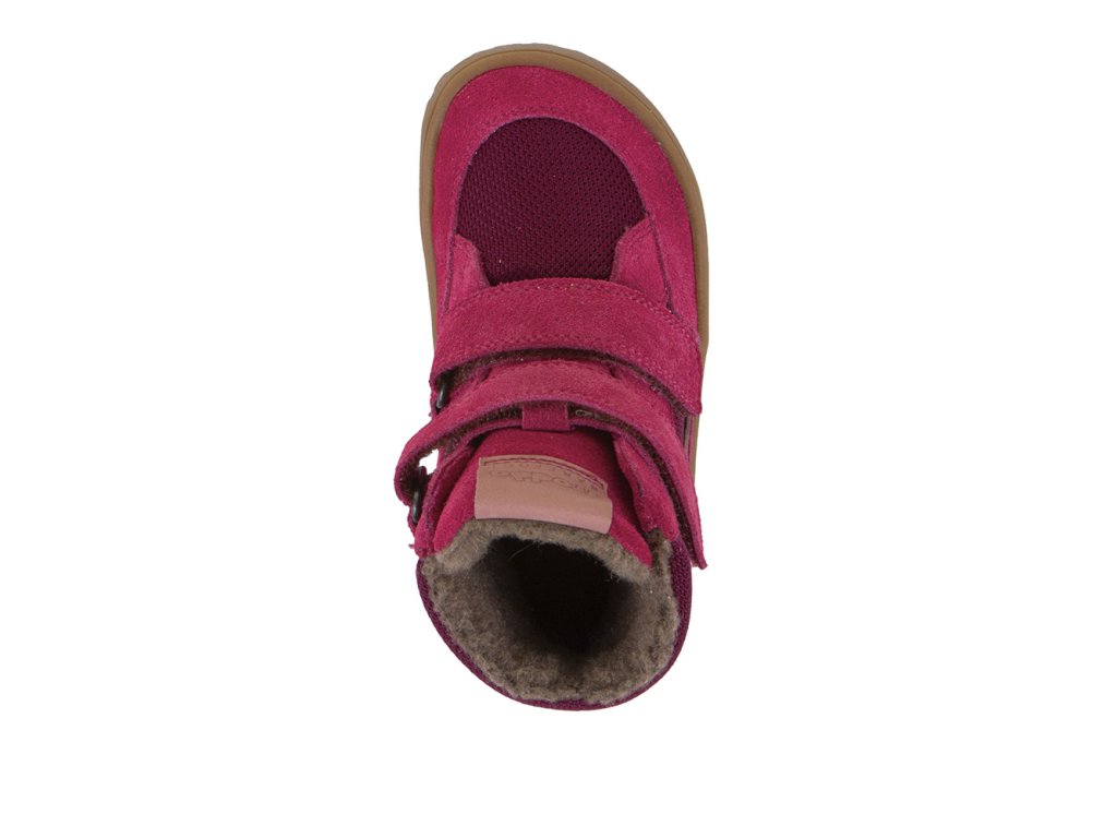 Dívčí zimní vyšší barefoot obuv s voděodolnou membránou FRODDO WINTER  TEX v sytě růžové barvě.