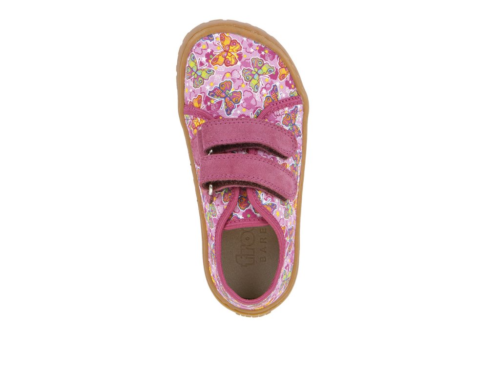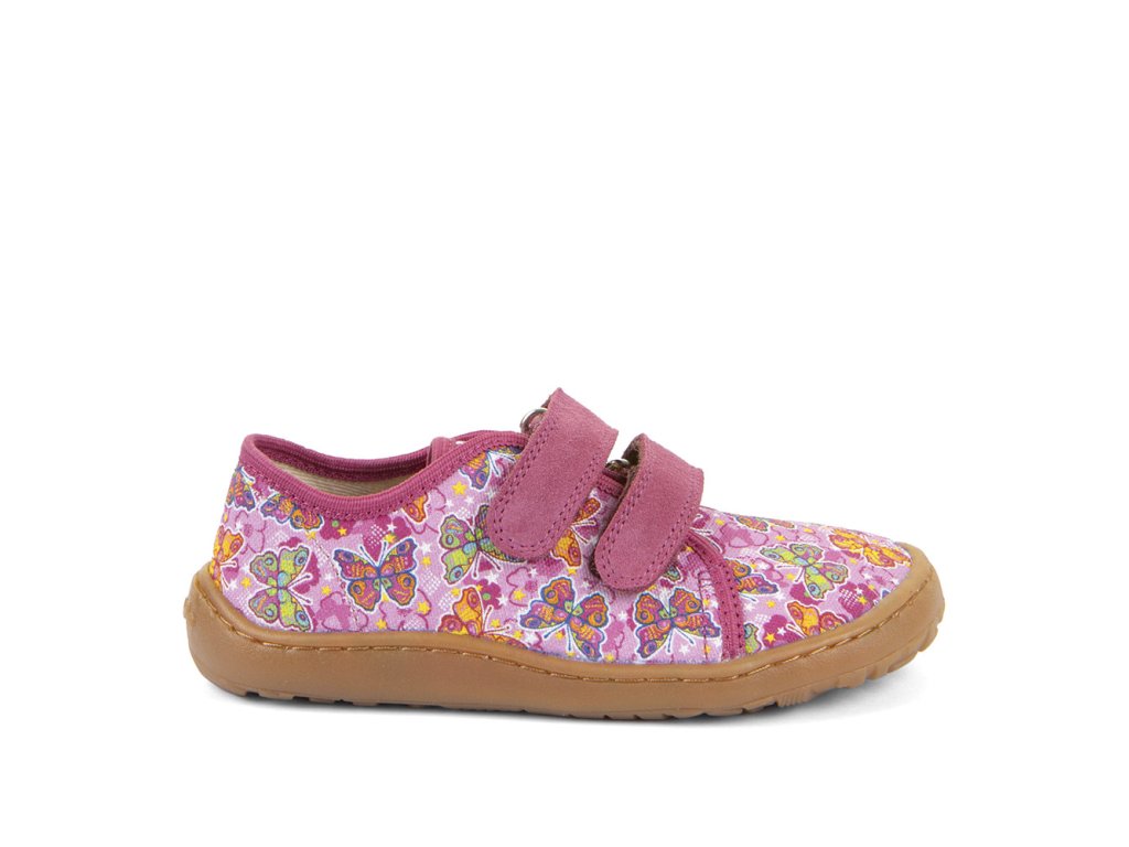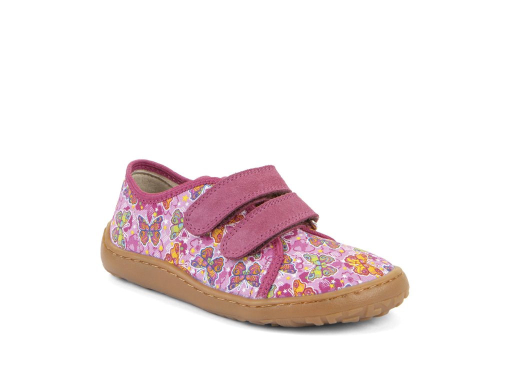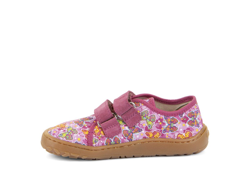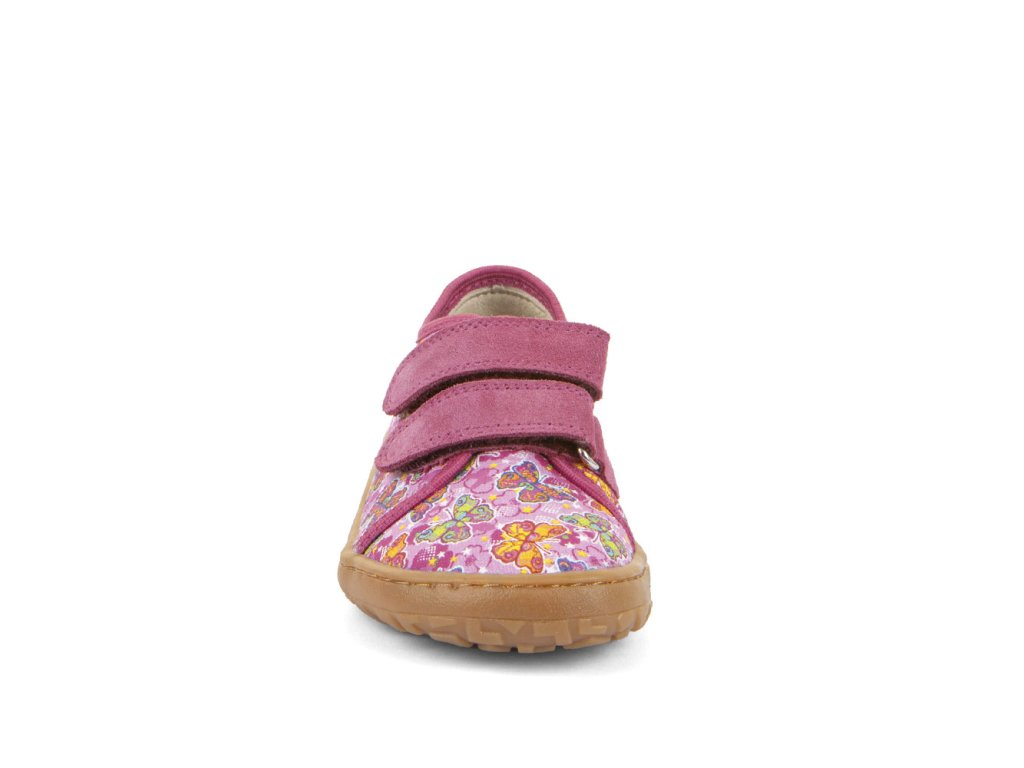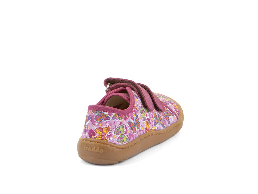 Dívčí plátěné barefoot tenisky FRODDO nízké - růžové s barevnými motýlky.