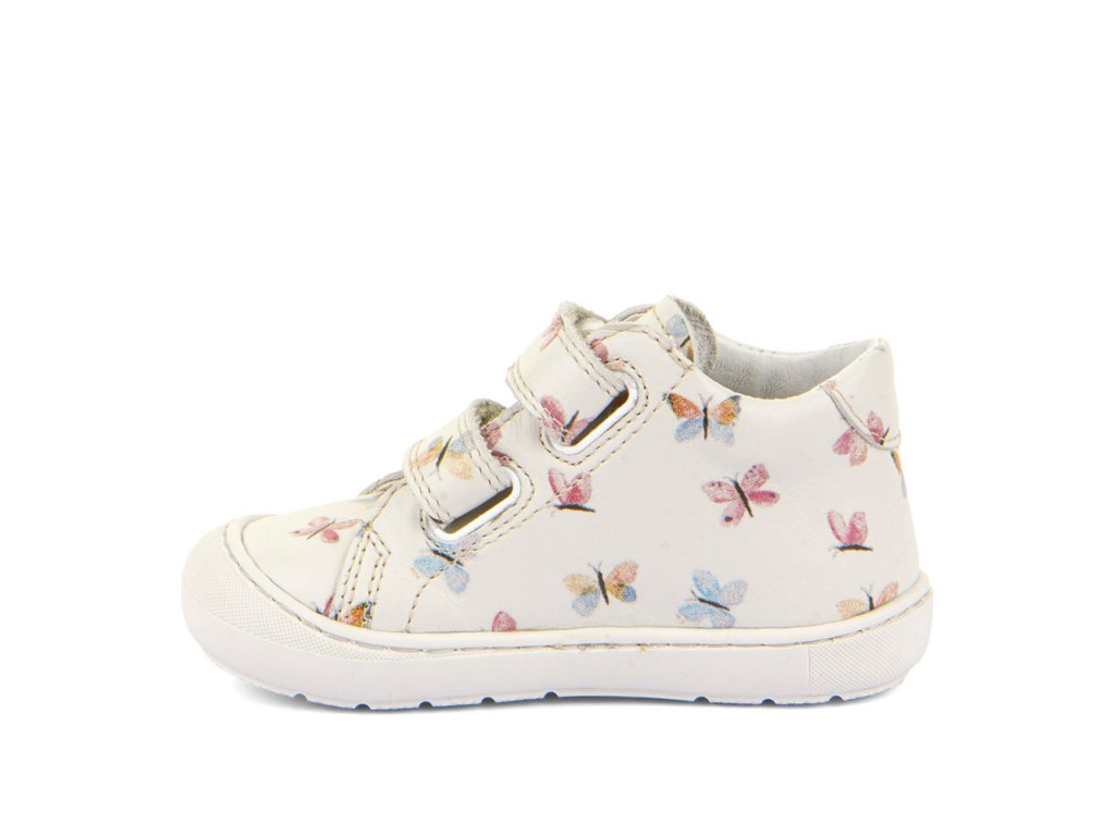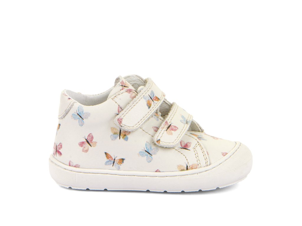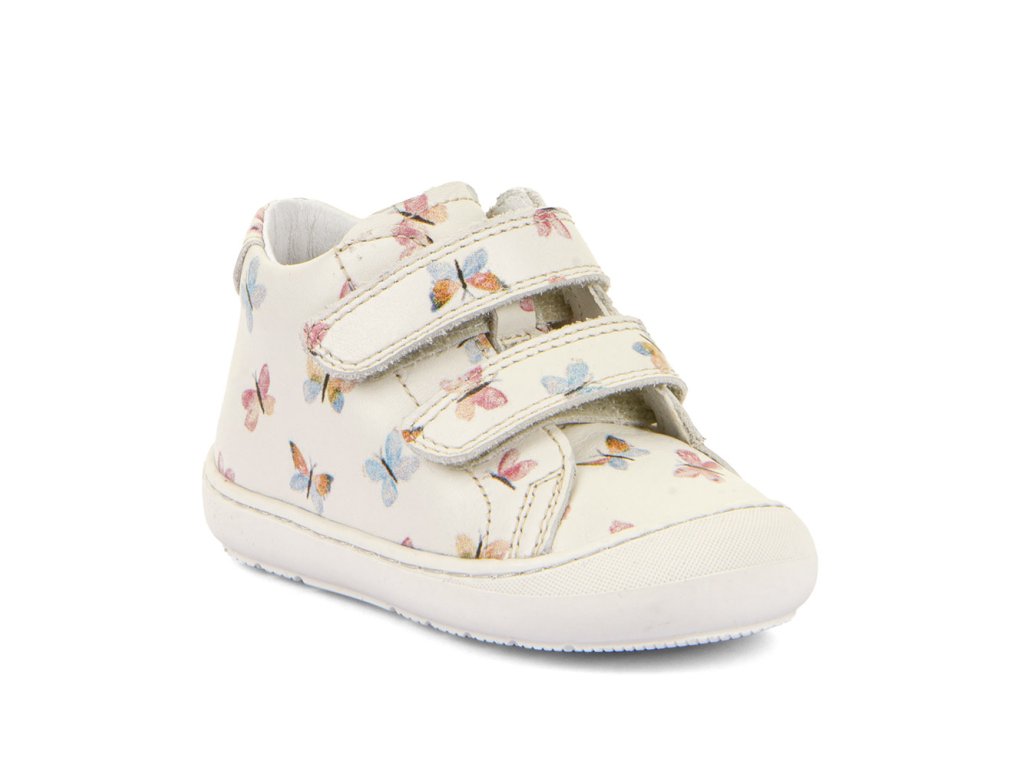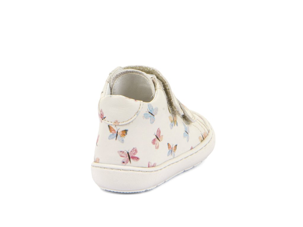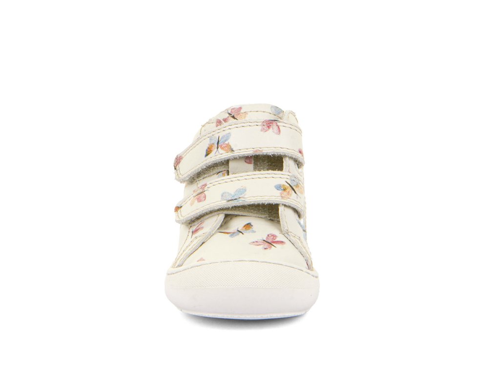 Dívčí celoroční kožená obuv FRODDO OLLIE ve světle krémové barvě s duhovými motýlky.