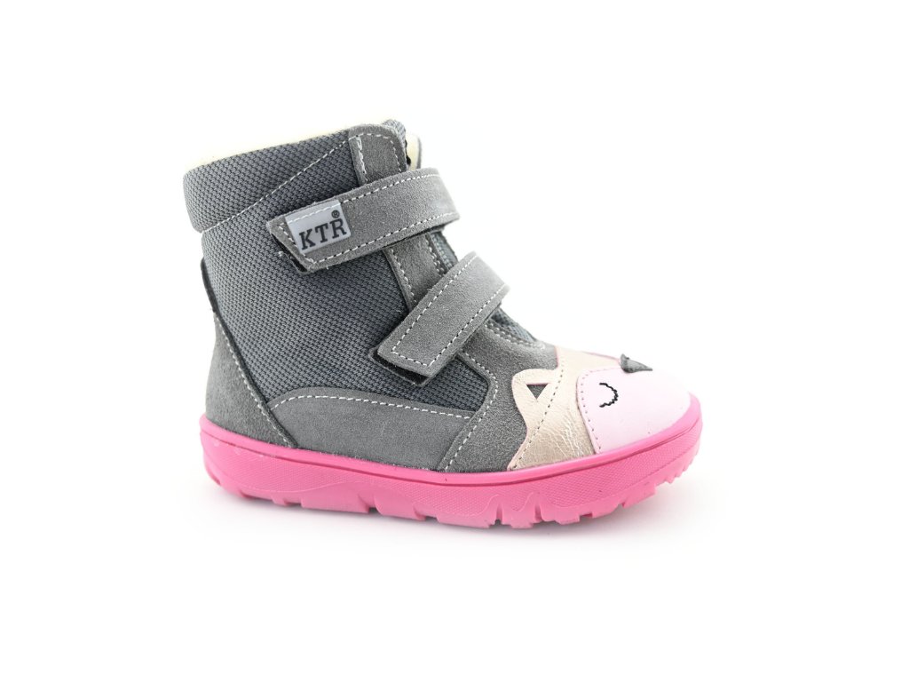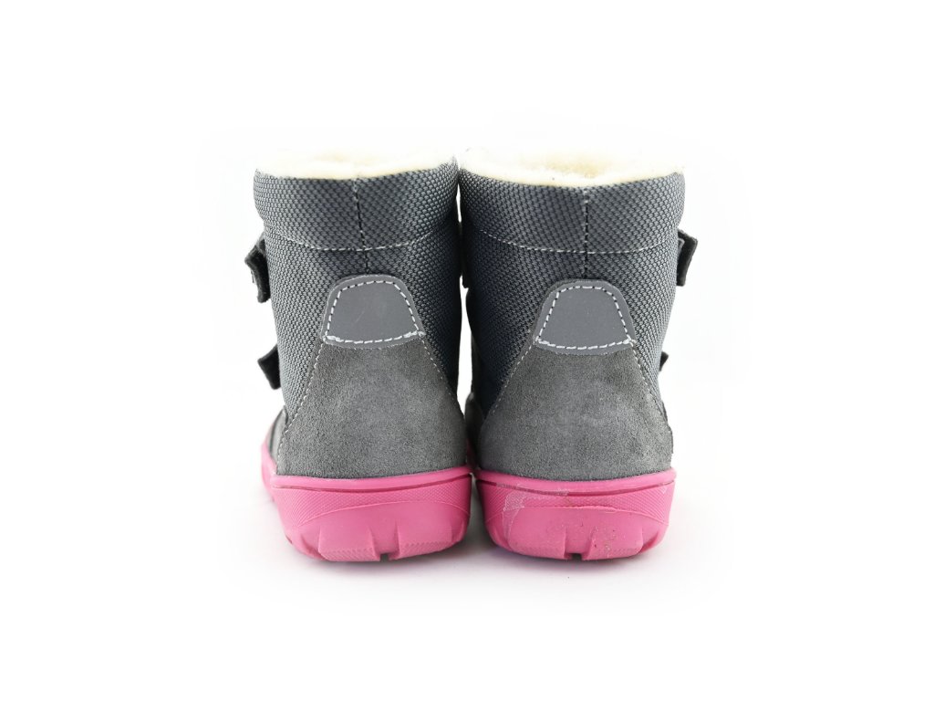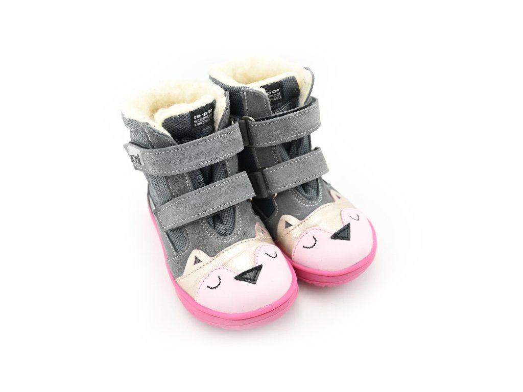 Zimní obuv od českého výrobce Konsorcium T+M s voděodolnou membránou TE-POR. Obuv má certifikát zdravých dětských bot "Žirafa". Botičky jsou lehké, měkké a ohebné s kvalitním zateplením pro maximální pohodlí ve sněhu a větru. TE-POR je nepromokavá a prodyšná membrána, která garantuje kompletní hydroizolaci a zajišťuje maximální komfort díky vnitřnímu odvodu potu. Svršek je z kombinaci broušené kůže a syntetiky, podrážka je velmi odolná, ohebná ve směru chůze a má hrubší protiskluzový vzorek. Boty jsou vyšší kotníkové, mají zapínání na dva suché zipy, pevný opatek a prostornou špičku. Botičky jsou zateplené ze 100% ovčí vlny včetně vlepené stélky. Inovovaná podešev s ohýbacími zónami v prstové části zajišťuje správný flex při chůzi.