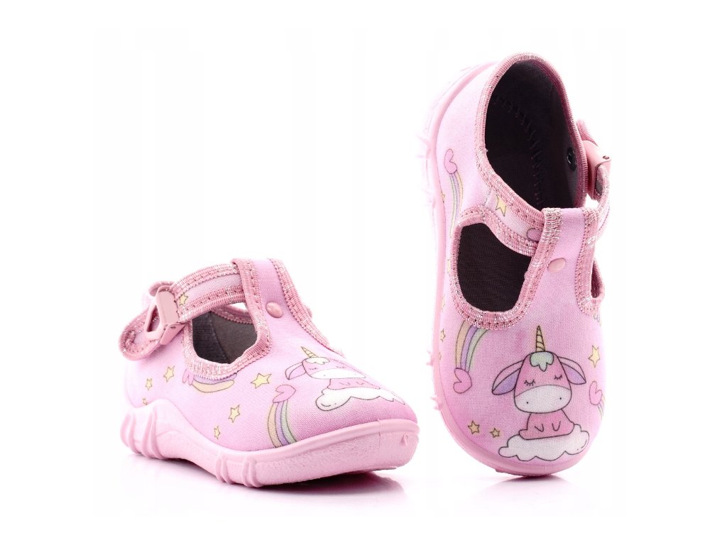 Dívčí papučky značky RAWEKS s anatomicky tvarovanou koženou stélkou - růžové s jednorožcem.
