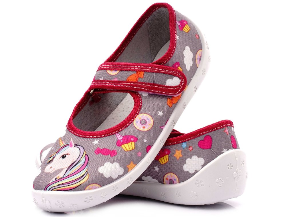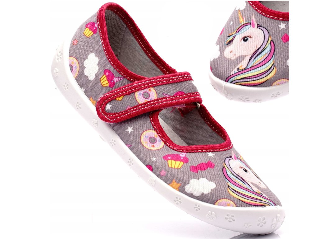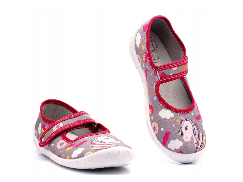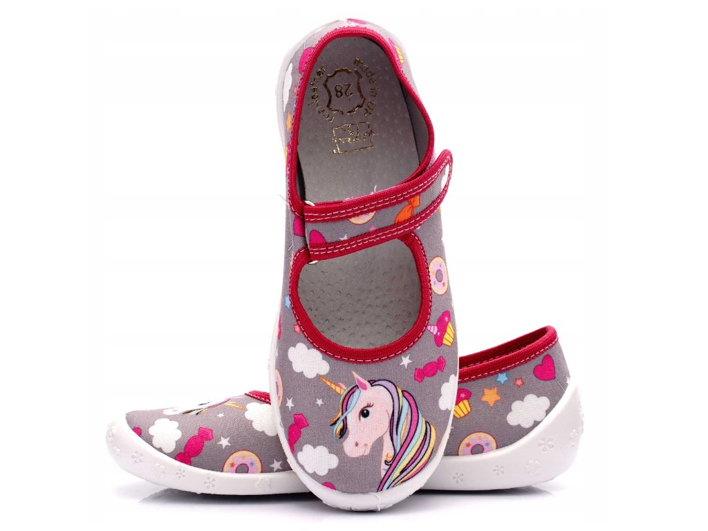 Dívčí papučky "balerínky" značky RAWEKS s anatomicky tvarovanou koženou stélkou -šedé jednorožec.