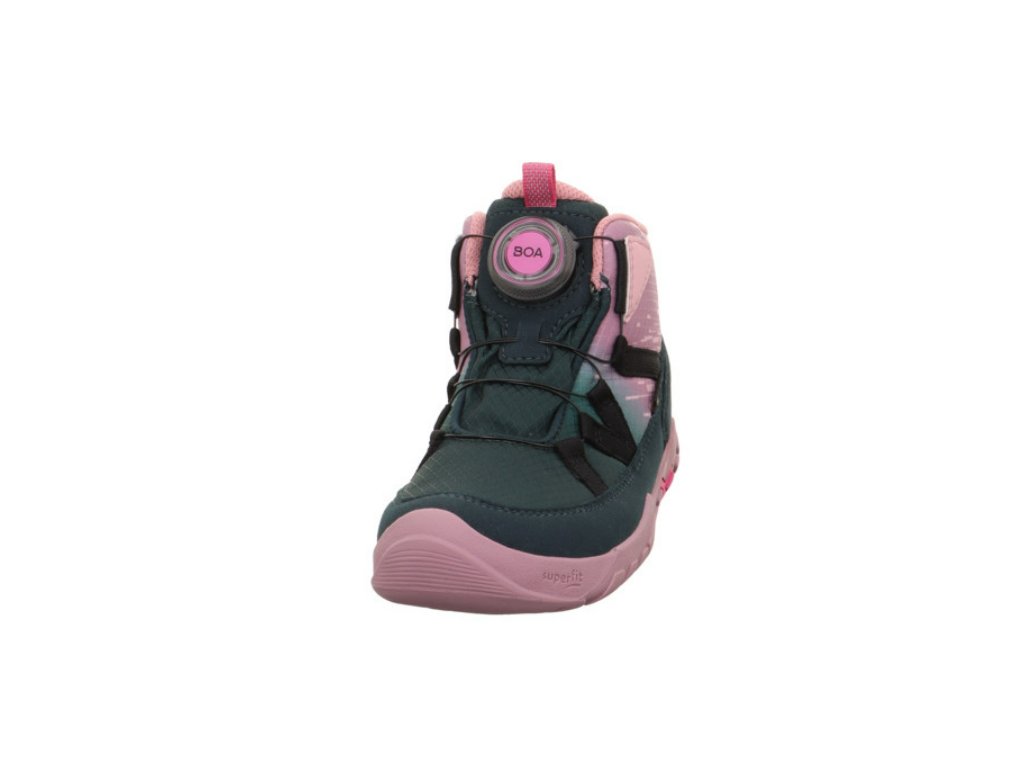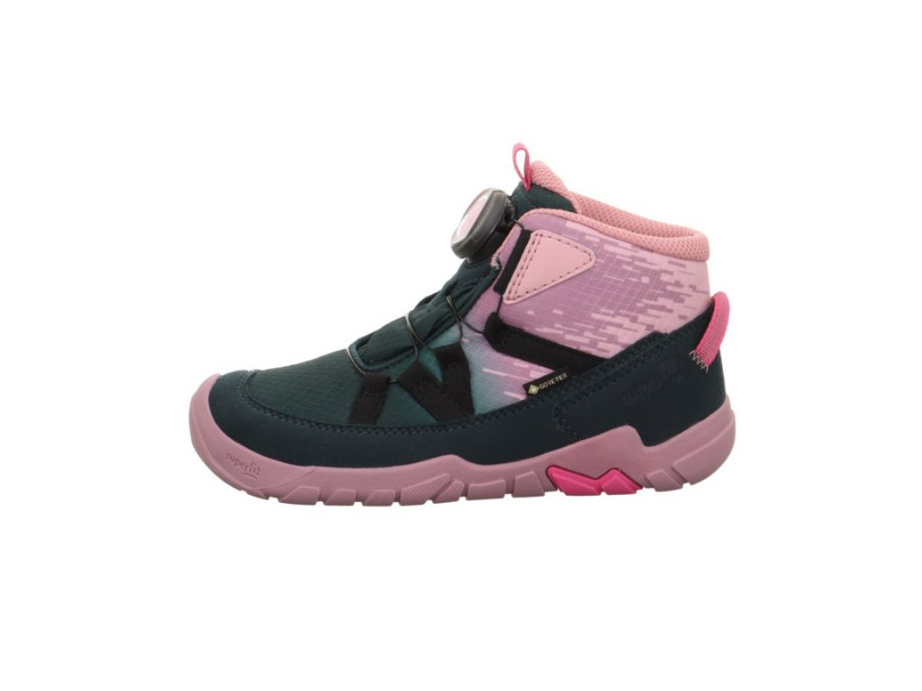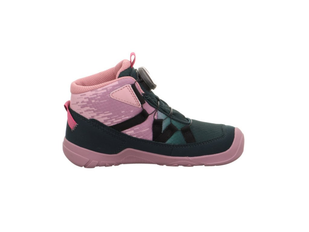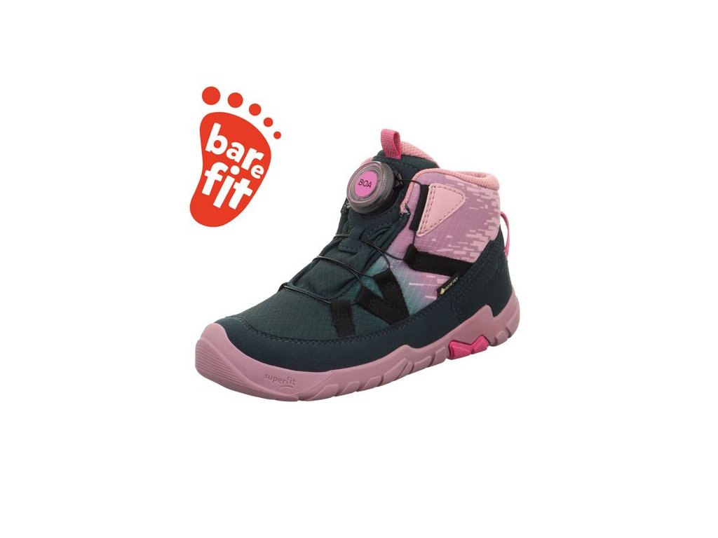 Celoroční/podzimní dětská obuv rakouské značky Superfit s nepromokavou membránou GORE-TEX® se zapínáním BOA® je vyrobena z nové kolekce BAREFIT - nový tvar podešve s prostornou špičkou, která zaručuje dostatečný prostor pro prsty. Tento model je možné zařadit jako barefootový kompromis, jsou extrémně lehké. Jsou vhodné pro chladnější podzim a začátek zimy, protože mají fleecovou stélku. Botičky zaujmou svojí flexibilitou a lehkostí. Podešev je měkká a ohebná, což umožnuje přirozený pohyb, zpočátku je tužší, ale je bez jakéhokoliv vyvýšení nebo podpory klenby, mají nulový drop. Boty jsou textilní a prodyšné, vnitřní část je také textilní, špička má mírný pogumovaný okop a lehce zpevněný opatek. Fleecová stélka je vyjímatelná a rovná. Anatomický tvar podešve je vhodný i pro dominantní palce. Zapínání je na dva suché zipy.