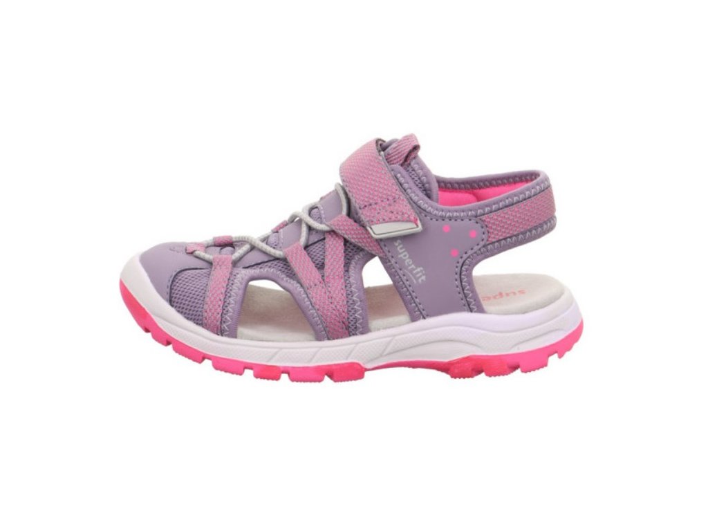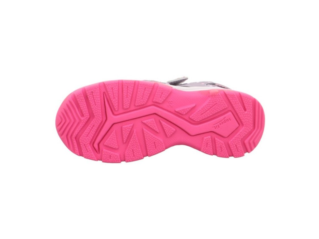 Dětské letní sandálky rakouské značky Superfit jsou vyrobeny ze syntetiky a textilu, vnitřní část je textilní, boty jsou měkké, vysoce odolné a jsou vhodné pro větší děti. Sandálky mají vlepenou koženou stélku, která je anatomicky tvarovaná a poskytuje dítěti maximální pohodlí. Podešev je velmi lehká, ohebná a pružná. Děti mají v sandálkách kryté prsty a volnou patu, nemají pevný opatek. Zapínání je na dva suché zipy, zapínání na nártu a na patě.
