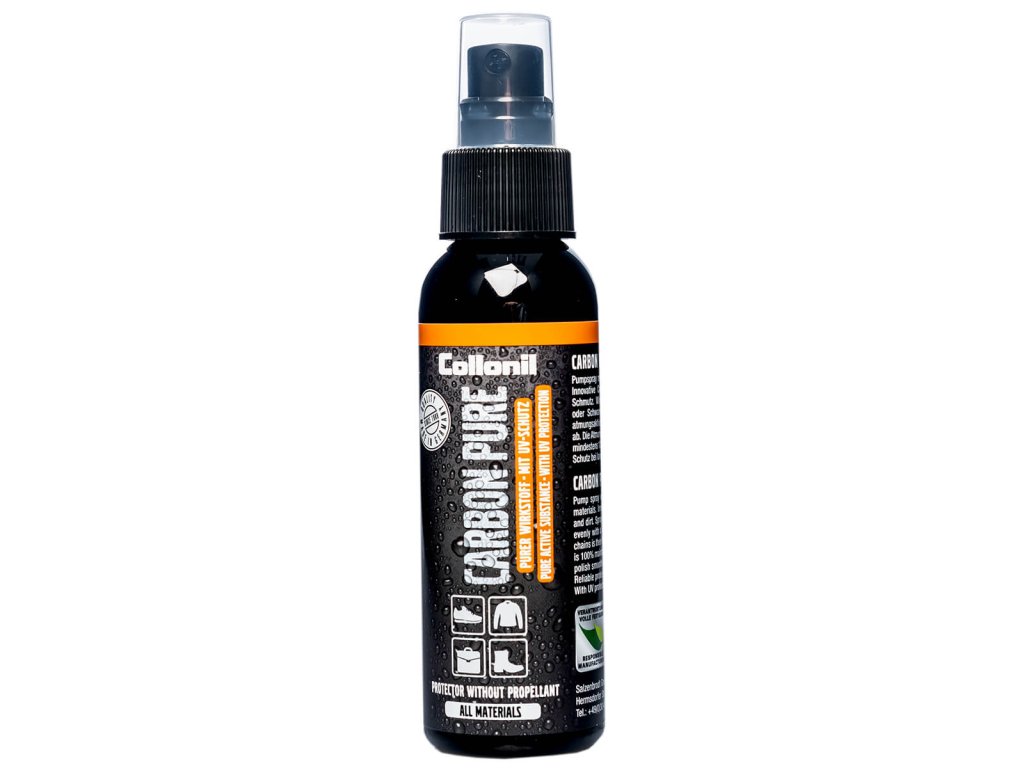 Impregnace obsahující čistou účinnou látku a UV filtr pro maximální ochranu bez hnacího plynu. Další z řady Carbon impregnací inspirovaný karbonovou technologií v oblasti impregnací s extrémně vysokou účinností. Carbon Pure má dlouhodobý účinek proti vlhkosti a nečistotám. Prodyšnost materiálu je na 100% zachována. Sprej s rozprašovačem neobsahuje žádné hnací látky a je tak možné jej používat i v uzavřených prostorách.