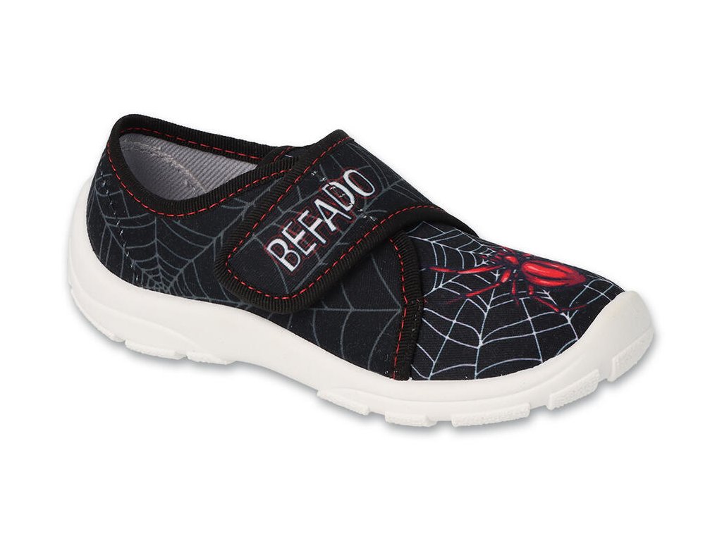 Chlapecké papučky na suchý zip, odvětraná podrážka zajišťuje prodyšnost obuvi a odvod nadměrné vlhkosti, lehká, pružná a protiskluzová podrážka pro pohodlí a bezpečnost chůze, speciálně vyztužená pata a zpevněné boky udržují nohu ve správné poloze, široké špičky pro volný pohyb prstů, kvalitní prodyšné materiály, snadné nazouvání se zapínáním na suchý zip. Obuv Befado je držitelem atestace "ZDRAVÁ STOPA" a certifikátu státního zkušebního institutu ITC Zlín v ČR (institut pro testování a certifikaci) a je navrhována ve spoluprávi s dětskými ortopedy. Obuv Befado splňuje nejnovější trendy designu a je vyráběna pomocí nejmodernějších technologií.